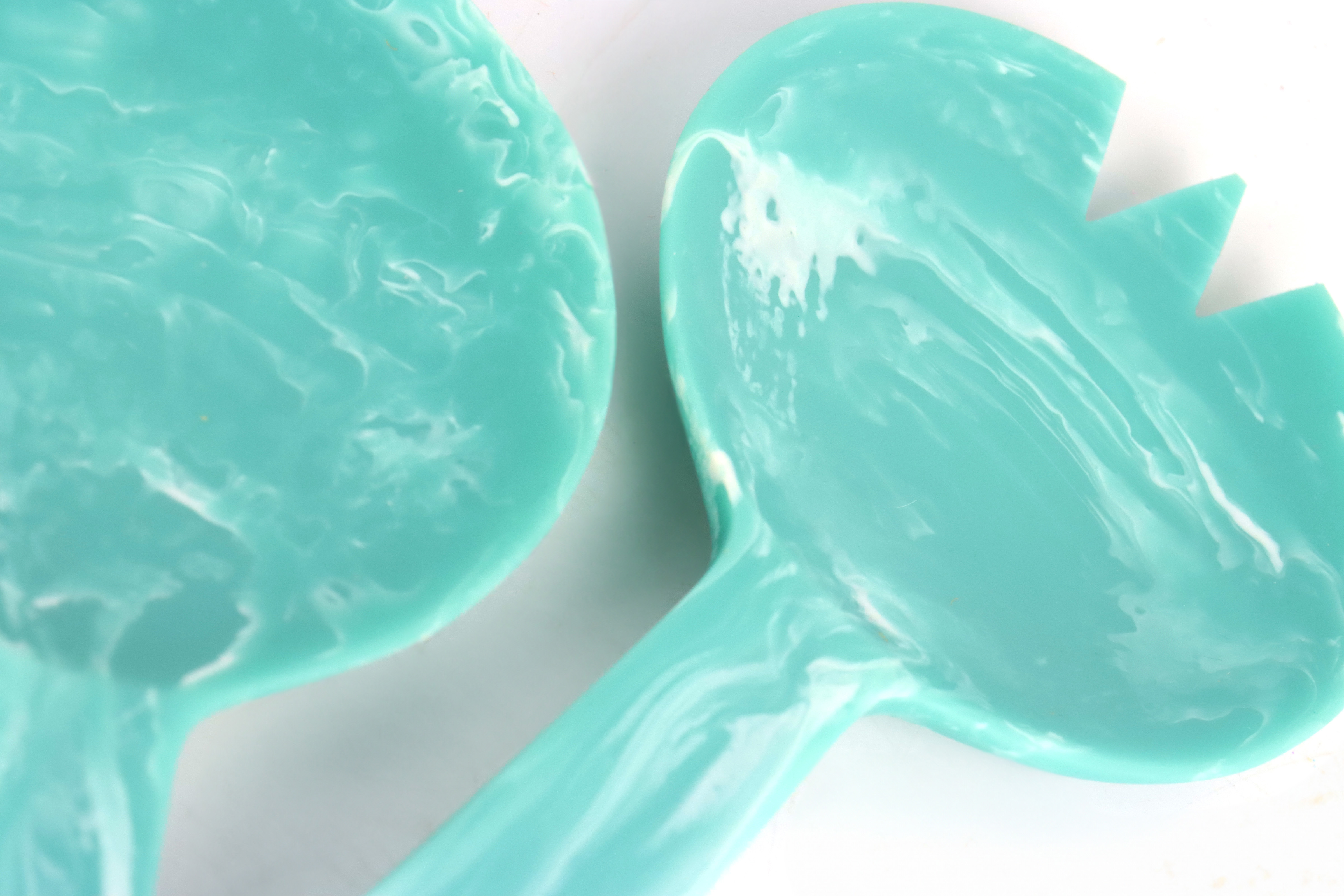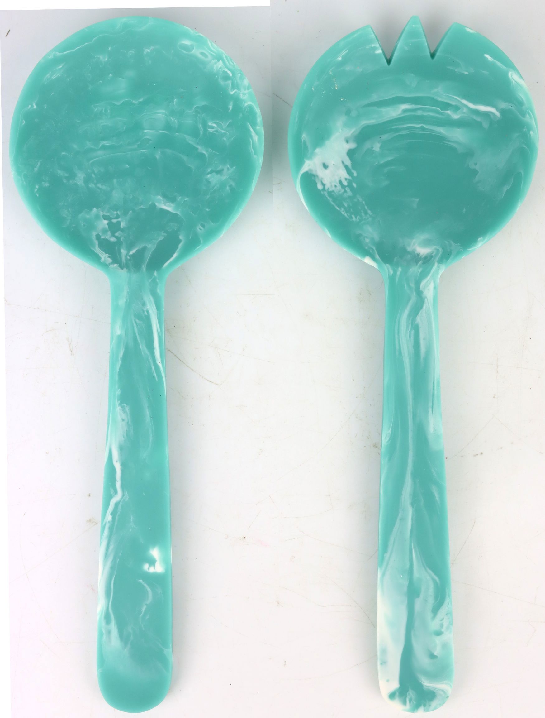 Gefertigt aus robustem Resin, vereint das Salatbesteck Langlebigkeit und Leichtigkeit. Die türkise Farbgebung ist nicht nur ein Symbol für Frische und Lebendigkeit, sondern bringt auch einen Hauch von Frühlings- und Sommerstimmung auf den Tisch. Das ausgefallene Alabaster-Design unterstreicht die Wertigkeit und verleiht dem Set eine besondere, moderne Note.