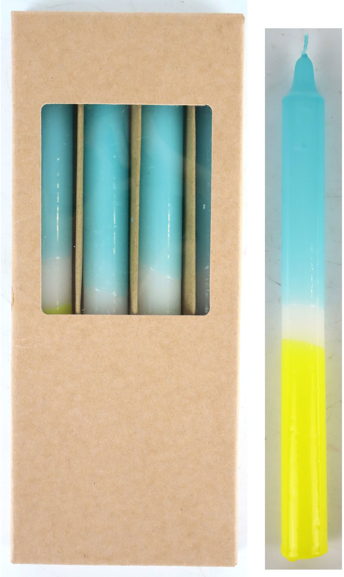 Das 4-teilige Set besteht aus eleganten Stabkerzen im faszinierenden Blau-Gelb Ombre-Look. Der Farbverlauf schafft nicht nur eine harmonische Verbindung zwischen den beiden Farbtönen, sondern taucht jeden Raum in ein warmes, einladendes Licht. Ob als Tischdekoration, als Eyecatcher im Schaufenster oder als stimmungsvoller Akzent für Veranstaltungen – diese Kerzen sind vielseitig einsetzbar und ein Hingucker in jedem Kontext.