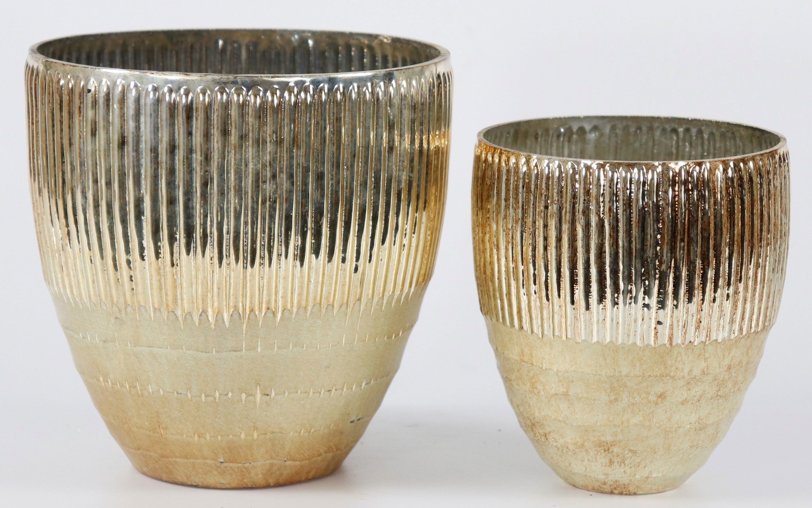 Die "LUCIDA" Windlichter und Vasen beeindrucken durch ihre erstklassige Verarbeitung und das ansprechende Design. Gefertigt aus hochwertigem Glas und in einer edlen Goldfarbe gehalten, fügen sie sich harmonisch in jede Umgebung ein. Mit einer Größe von ca. 13 cm und 16 cm eignen sie sich perfekt für die Präsentation auf Tischen, Regalen oder Fensterbänken. Nutzen Sie das kleinere Gefäß, um leuchtende Teelichter stimmungsvoll in Szene zu setzen, während das größere Ihrer Kreativität als Vase freien Lauf lässt. Verwandeln Sie mit saisonalen Blüten, Ästen oder Herbstblättern jeden Raum in ein stilvolles Ambiente.