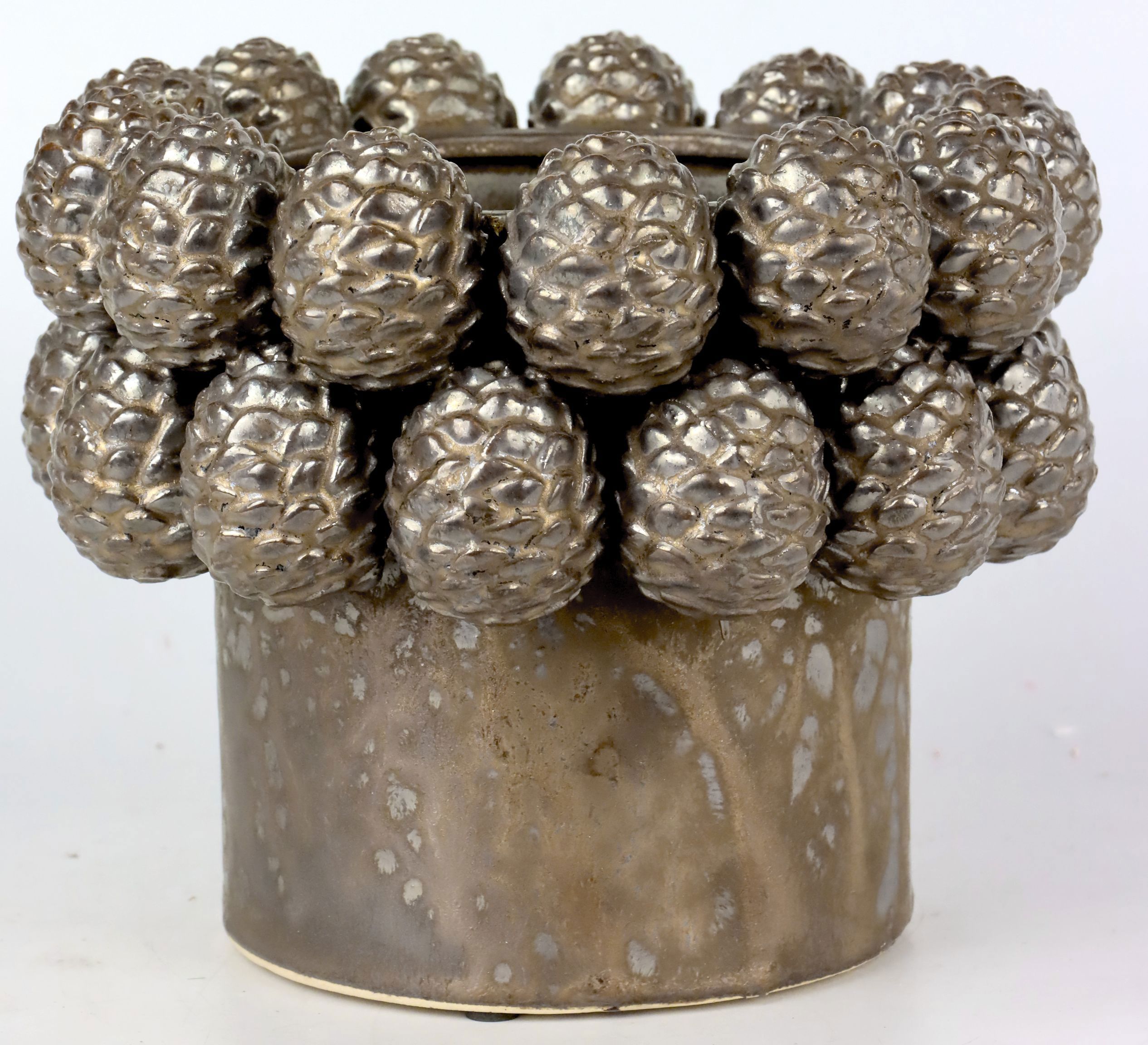 DEBei der Herbst- und Winterdekoration darf unser Übertopf "La Pigna" auf keinen Fall fehlen. Dieses Schmuckstück überzeugt durch seine liebevoll gestaltete Form eines Tannenzapfens und sorgt für ein natürliches Ambiente in Ihrem Wohnbereich. Hergestellt aus Keramik und beendet mit einer glänzenden silbernen Oberfläche, lässt es sich problemlos in jede Einrichtung einfügen.