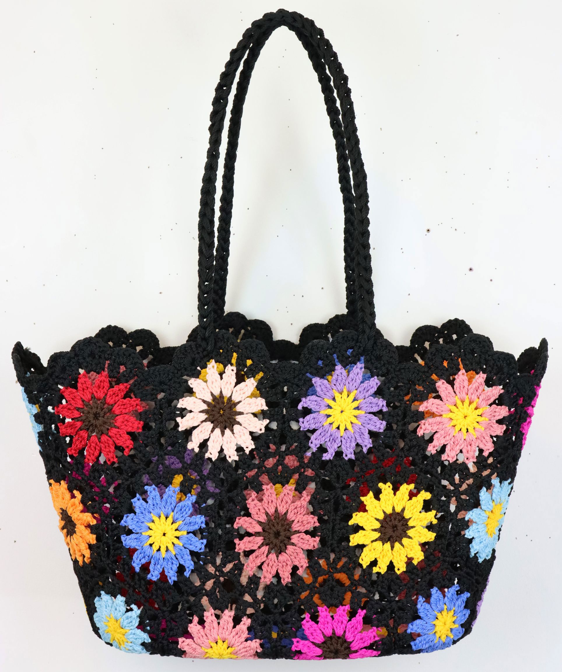 Entdecken Sie das stilvolle Accessoire für die Frühlings- und Sommerkollektion: die gehäkelte Tasche "FLOWERAGE". Diese exklusive Tasche kombiniert traditionelles Handwerk mit modernem Design und wird so zum idealen Begleiter für den stationären Einzelhandel im Bereich Wohnen und Lifestyle. Die Tasche ist aus hochwertiger, schwarzer Baumwolle gefertigt und mit aufwendigen Blumenapplikationen versehen, die in dezenten, natürlichen Farben gehalten sind. Mit einer Größe von ca. 45 cm bietet sie ausreichend Platz für die alltäglichen Notwendigkeiten und lässt sich mühelos in den urbanen und ländlichen Alltag integrieren.