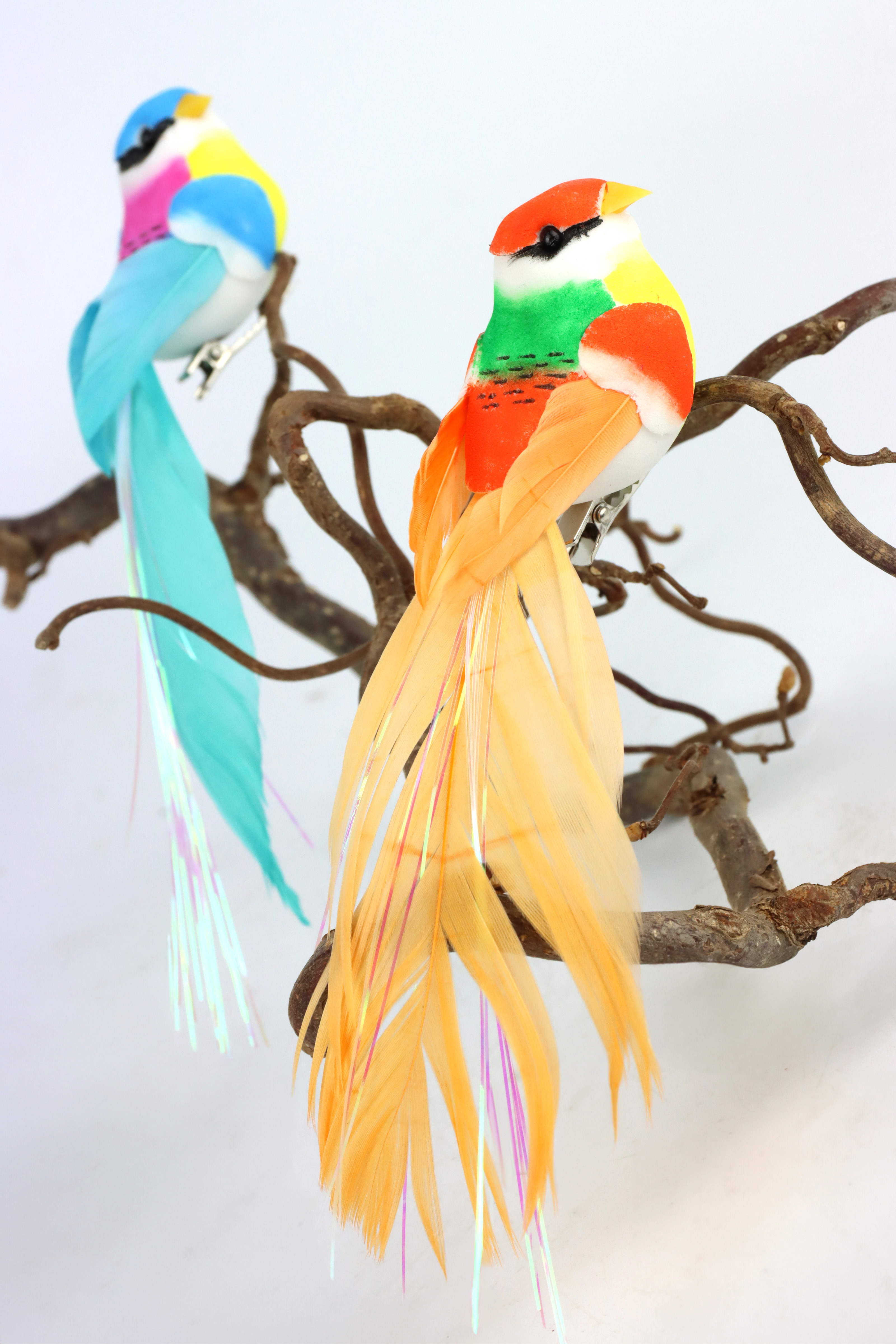 Jede Vogelklammer ist etwa 16 cm groß und kombiniert hochwertige Materialien wie Styropor, Kunstfedern und Metall. Diese Materialzusammenstellung sorgt nicht nur für eine schöne Optik, sondern auch für eine lange Lebensdauer und Stabilität der Klammern. Die Verwendung von Kunstfedern verleiht den Vögeln ein besonders natürliches Aussehen, das Ihre Kunden begeistern wird.