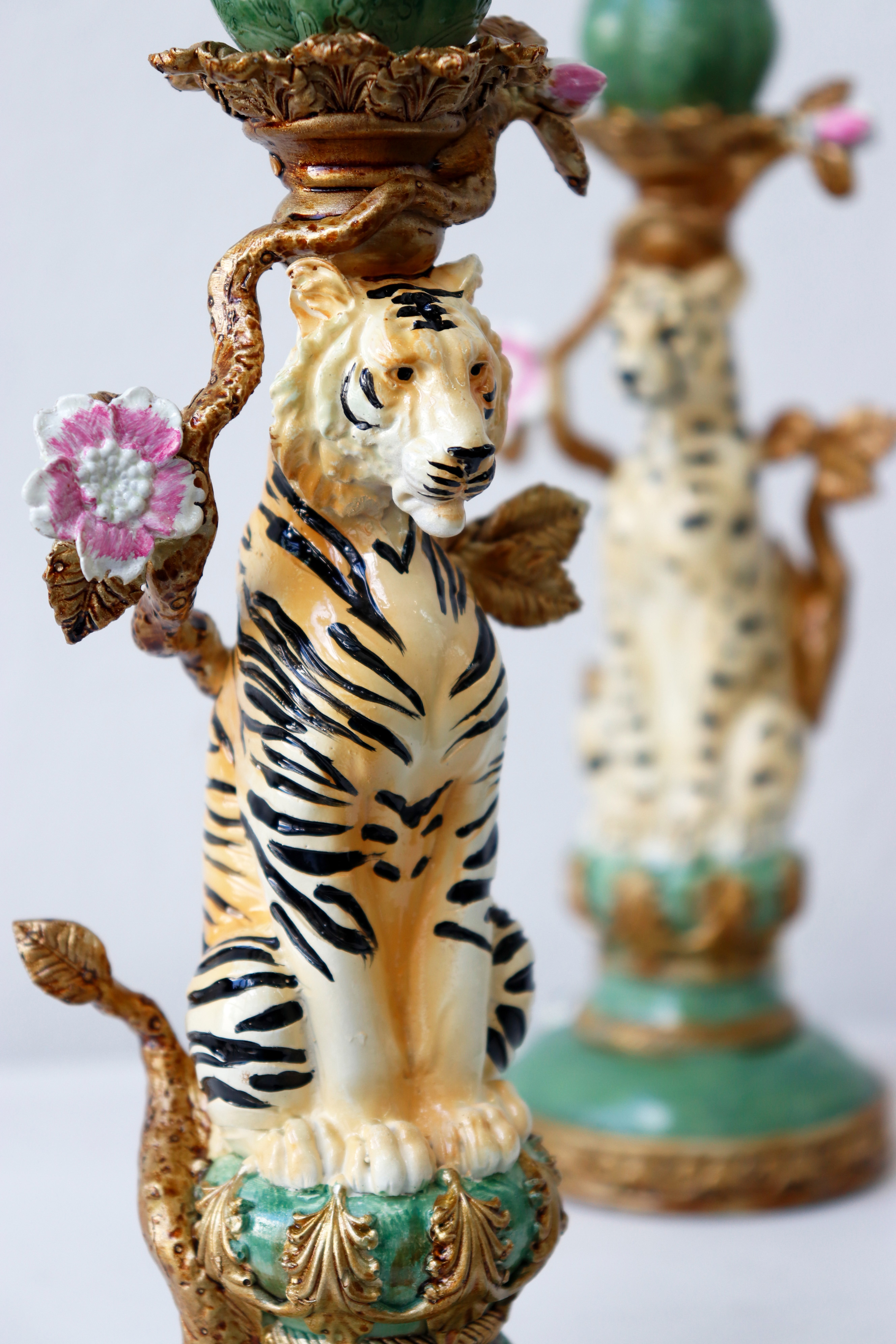 Dieses hochwertige Leuchter-Set, bestehend aus zwei atemberaubenden Leuchtern, ist mit detaillierten Leopard- und Tigermotiven verziert. Diese Designs spiegeln die mächtige Eleganz und das dynamische Wesen dieser majestätischen Kreaturen wider. Sie fügen jedem Raum einen Hauch von Abenteuer und Raffinesse hinzu und schaffen eine warme und einladende Atmosphäre. Die neutral gehaltene Farbpalette dieser Leuchter fügt sich nahtlos in jedes Wohnkonzept ein und bietet endlose Kombinationsmöglichkeiten mit verschiedenen Einrichtungsstilen.