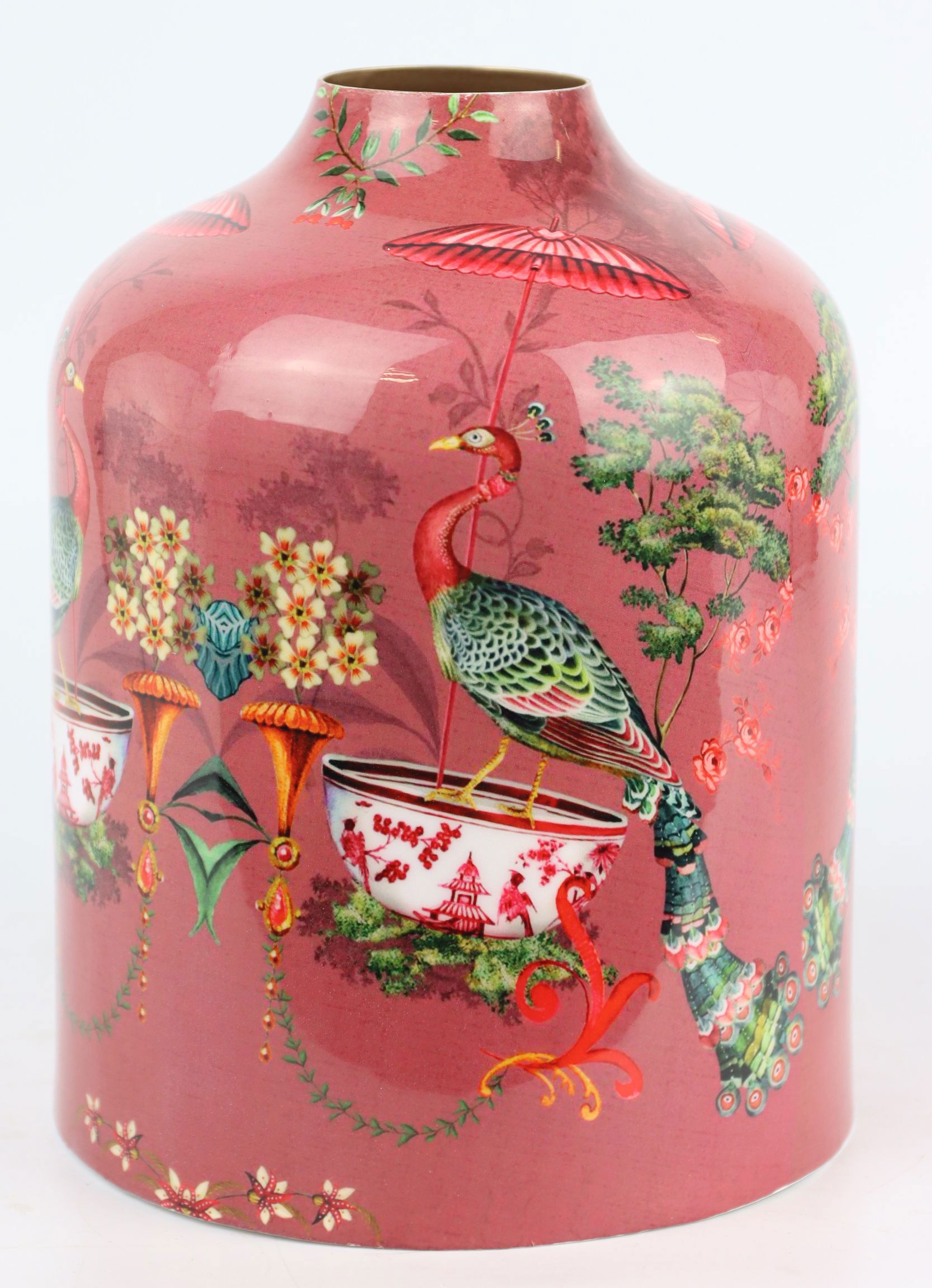 Die Vase "Asian Fauna" besticht durch ihre kunstvolle Gestaltung und die harmonische Farbgebung in einem satten Rotton. Ein beeindruckender Pfau, Symbol für Schönheit und Anmut in der asiatischen Kultur, schmückt die Oberfläche der Vase und zieht sofort alle Blicke auf sich. Mit ihrem großzügigen Durchmesser von 18 cm und einer Höhe von 23 cm eignet sich die Vase ideal für auffällige Blumenarrangements oder kann als eigenständiges Dekorationselement fungieren, um Ihrem Wohnraum eine exotische Note zu verleihen.