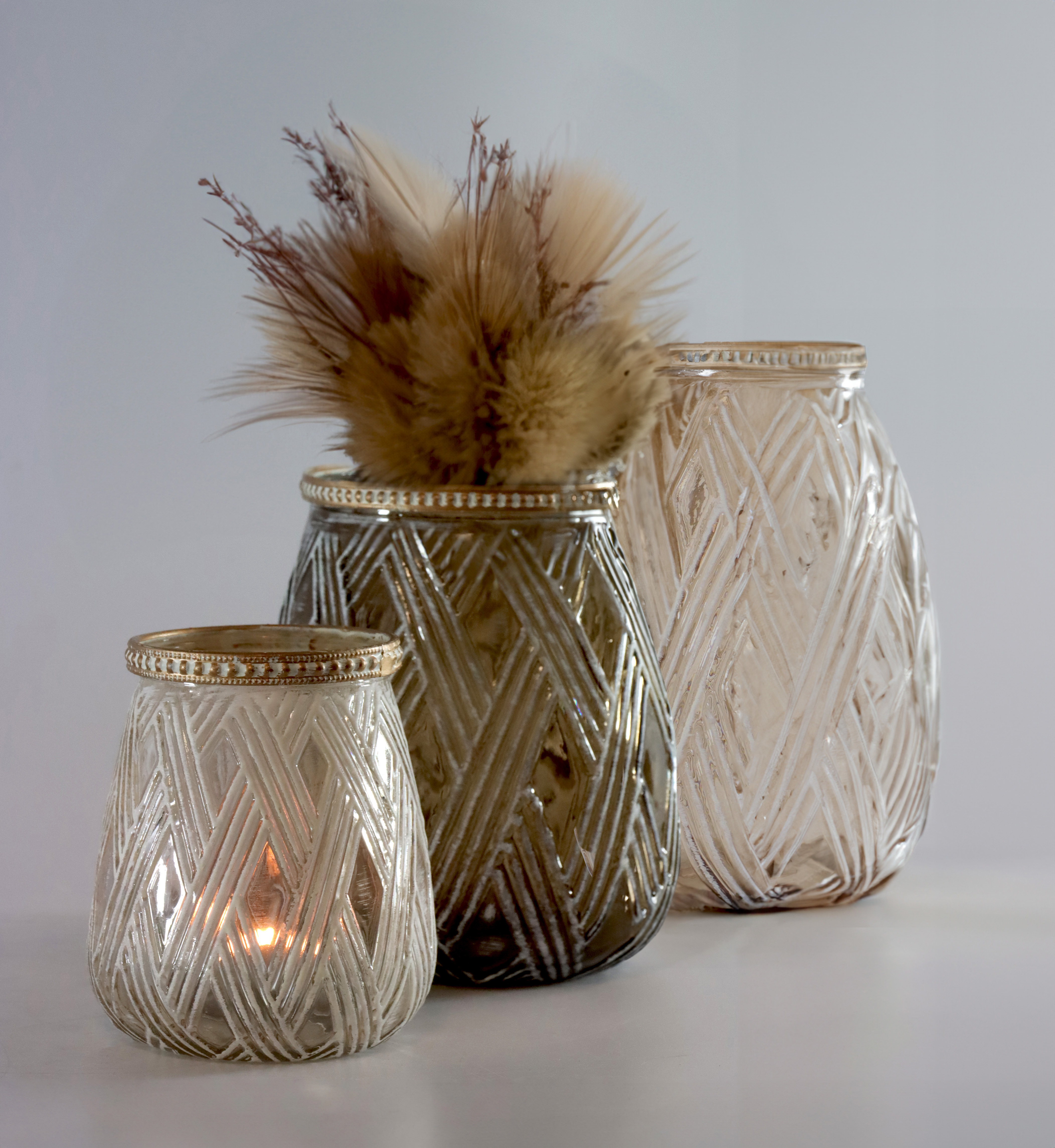 Bringen Sie eine warme und einladende Atmosphäre in Ihr Ladengeschäft oder inspirieren Sie Ihre Kunden, ihr Zuhause stilvoll zu gestalten mit unserem dreiteiligen Set "FÈS". Dieses Set, bestehend aus drei Windlichtern oder Vasen in unterschiedlichen Größen und natürlichen Farbtönen, eröffnet unzählige Dekorationsmöglichkeiten und lässt sich perfekt in ein modernes, rustikales oder skandinavisches Wohnambiente integrieren.