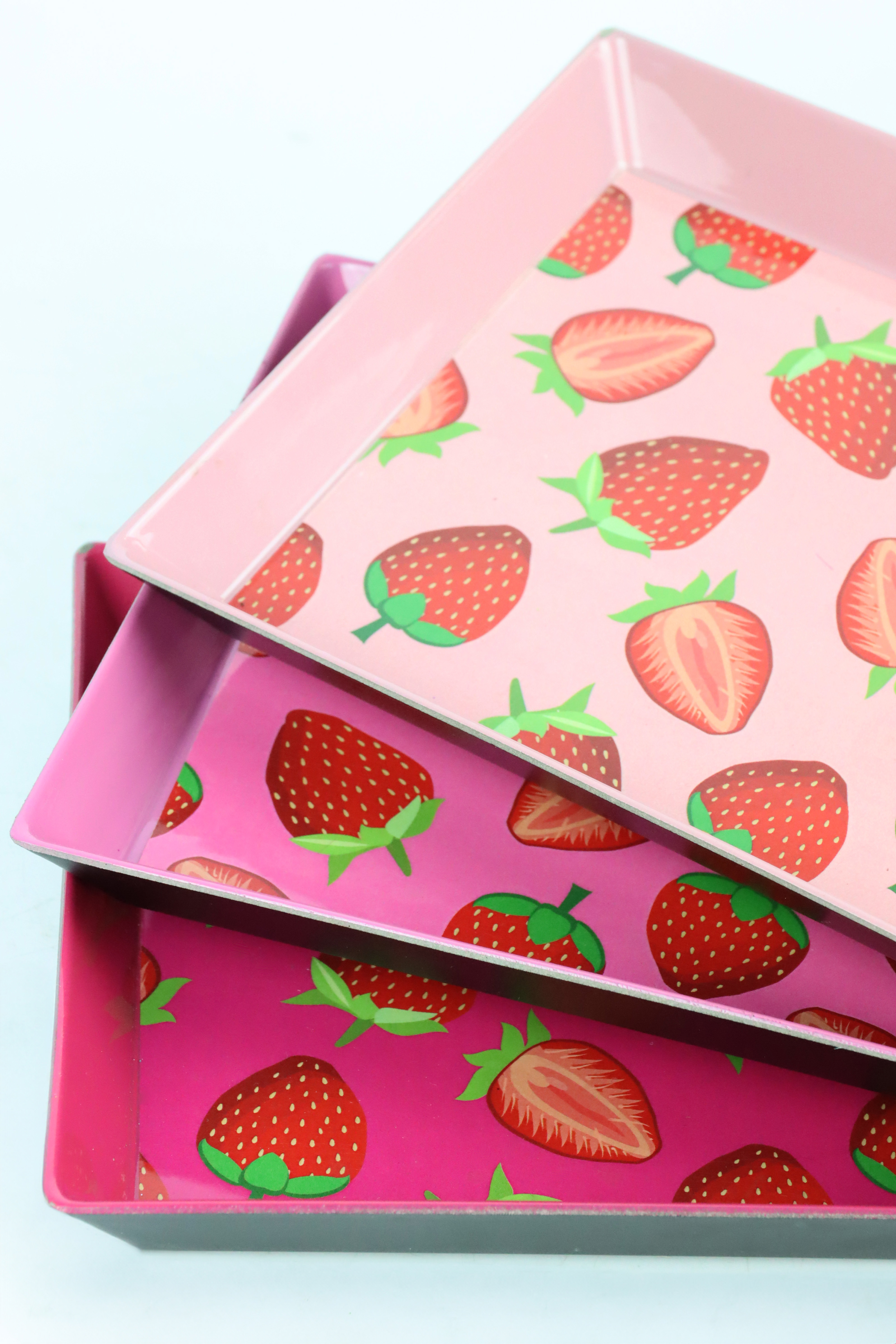 Die farbenfrohen Erdbeermotive verleihen den Tabletts eine frische und lebendige Ausstrahlung. Sie bringen nicht nur einen Hauch Sommer in jeden Raum, sondern sind auch ein Verkauffokus für Händler, die ihren Kunden etwas Besonderes bieten möchten. Präsentieren Sie dieses fröhliche Set in Ihrem Ladengeschäft als dekorativen Blickfang oder integrieren Sie es in themenbezogene Displays, um das Interesse Ihrer Kunden zu wecken.