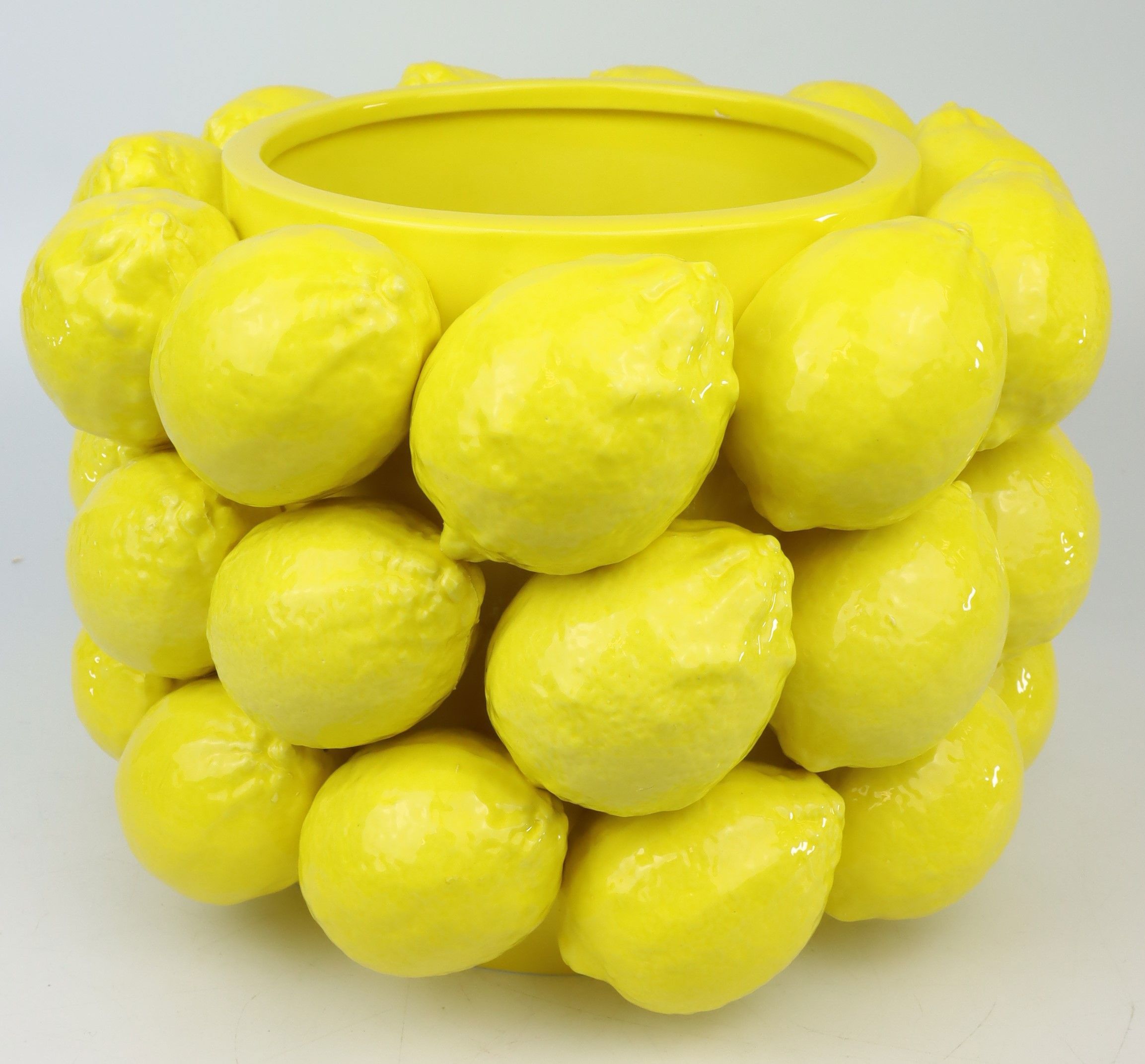 Der ÜBERTOPF "LIMONE" besticht durch seine brillante Gelbnuance, die jedem Raum ein lebendiges, warmes Ambiente verleiht. Die detaillierte Zitronenstruktur sorgt für einen lebensechten und stilvollen Look. Dieses Design ist perfekt für Einzelhändler, die ihren Kunden erfrischende Akzente bieten möchten. Ein ideales Accessoire für Pflanzenliebhaber und eine elegante Wahl für die Dekoration im Innen- und Außenbereich, sei es für das Wohnzimmer, die Küche, den Wintergarten oder die Terrasse.