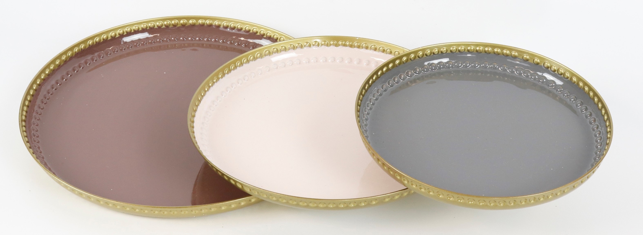 Diese wunderschönen Tabletschalen überzeugen mit einem harmonischen Farbspiel in Braun, Rosa und Grau. Gefertigt aus robustem Metall, sind sie nicht nur ein echter Hingucker, sondern auch besonders langlebig. Die unterschiedlichen Größen mit einem Durchmesser von 31 cm, 25,5 cm und 21,5 cm erlauben vielfältige Einsatzmöglichkeiten und machen das Set zu einem vielseitigen Accessoire für jede Einrichtung.