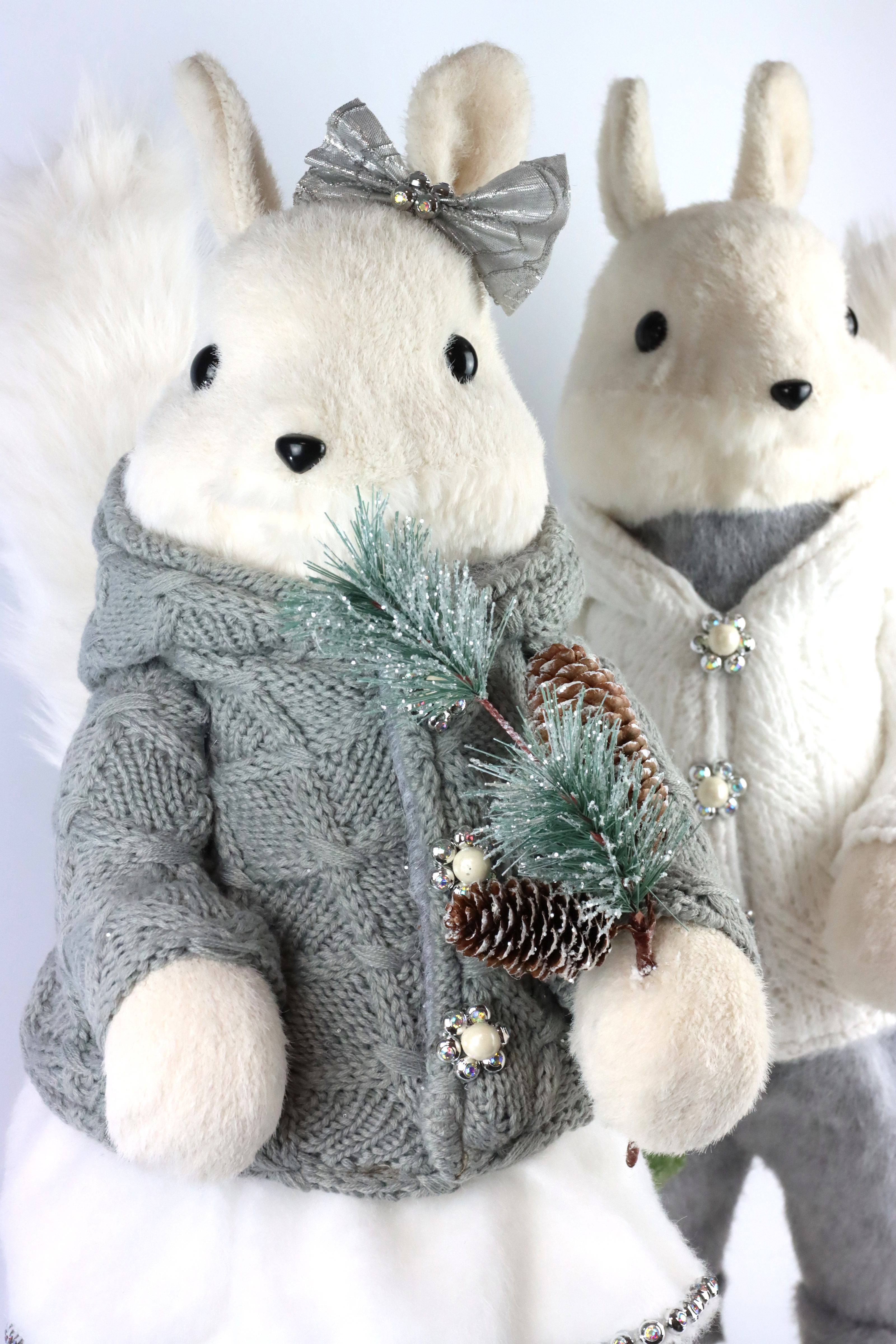 Verleihen Sie Ihrem Sortiment in der Weihnachtszeit einen Hauch von winterlicher Magie mit unserem zauberhaften Eichhörnchen "Frosty Tails" Set. Dieses zweiteilige Set, bestehend aus einem Paar frostiger Eichhörnchen, bietet die perfekte Ergänzung für jede weihnachtliche Dekoration im Einzelhandel. Die in eleganten Grau- und Weißtönen gehaltenen Tiere strahlen eine edle und zugleich verspielte Eleganz aus, die in jeder Umgebung ein festliches Highlight setzt.