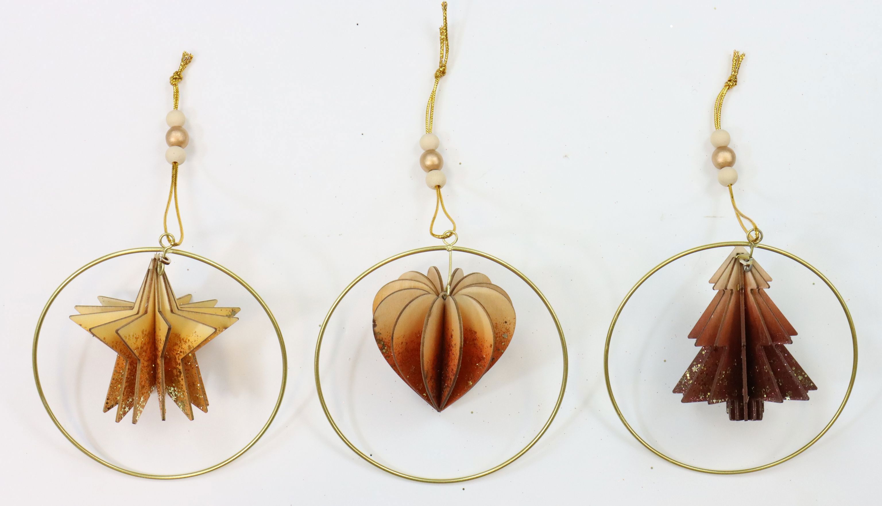 DEErleben Sie die festliche Magie der Weihnachtszeit mit unserem exquisiten 3-teiligem Set 3D-Holzhänger "Natural Woods". Speziell für den stationären Einzelhandel im Bereich Wohnen und Lifestyle konzipiert, bietet dieses Set aus Herz, Tannenbaum und Stern eine wundervolle Möglichkeit, Ihre Produktangebote um ein exklusives und ansprechendes Element zu erweitern. Jedes Ornament aus diesem erstklassigen Set vereint rustikalen Holzcharme mit eleganten Metallelementen, die gemeinsam ein harmonisches und natürliches Erscheinungsbild schaffen. Mit einer Größe von etwa 13 cm sind diese 3D-Hänger die perfekte Ergänzung für jedes Weihnachtsambiente.