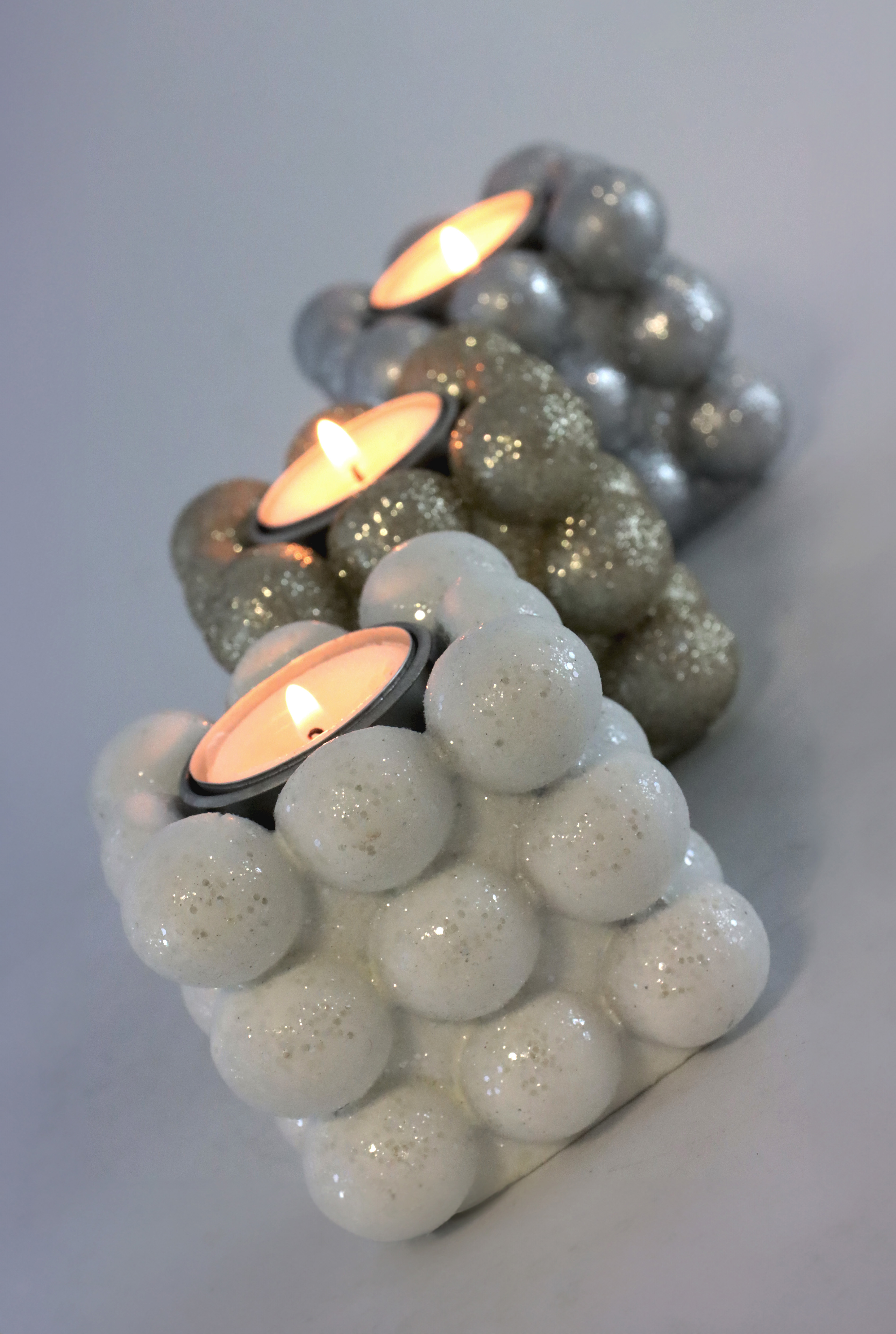 - Festliches Set aus drei Leuchtern in Silber, Weiß und Gold
