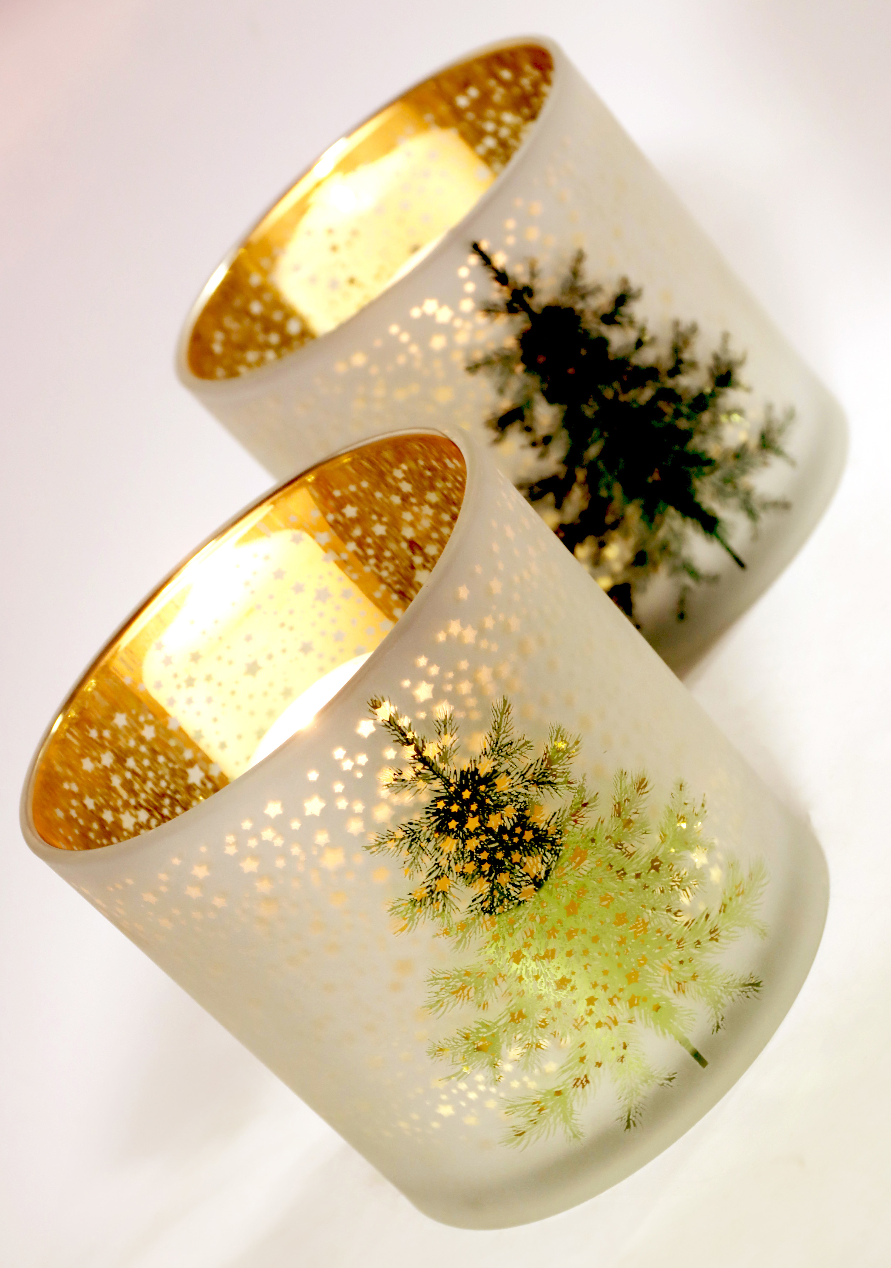 - **Set beinhaltet**: 2 Windlichter in Weiß und Gold