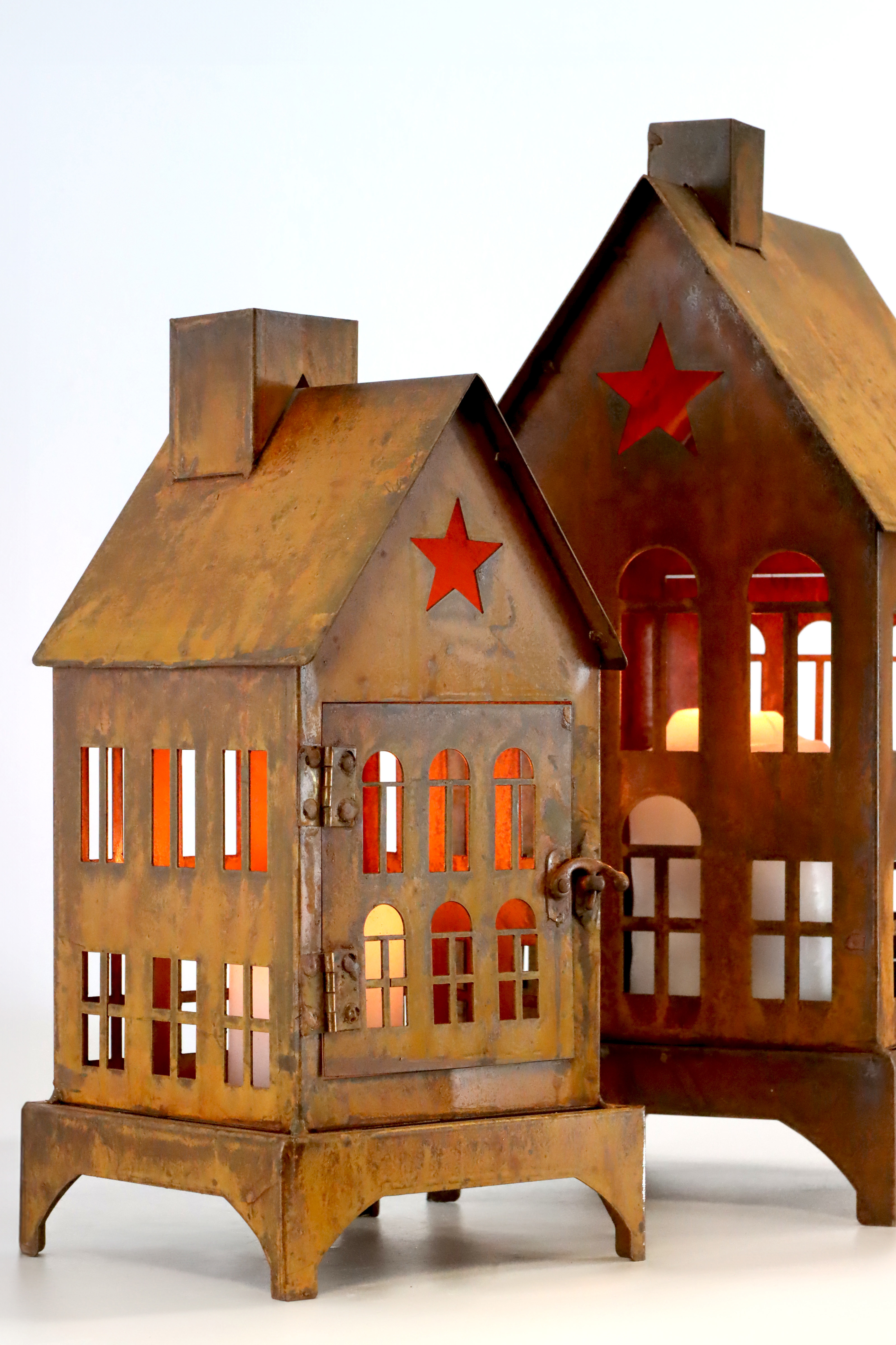 DEEintauchen in die warme, behagliche Atmosphäre der "LA VILLE" Laternenhäuser, Artikelnummer 7283, in der Saison Herbst/Winter. Dieses zweiteilige Set aus rostfarbenem Eisen, mit einer Größe von etwa 63 cm, bringt ein einzigartiges, wohnliches Flair in jeden Raum. Perfekt für den stationären Einzelhandel im Bereich Wohnen und Lifestyle, die stets nach spannenden neuen Produkten suchen, um ihren Kunden das Beste zu bieten.
