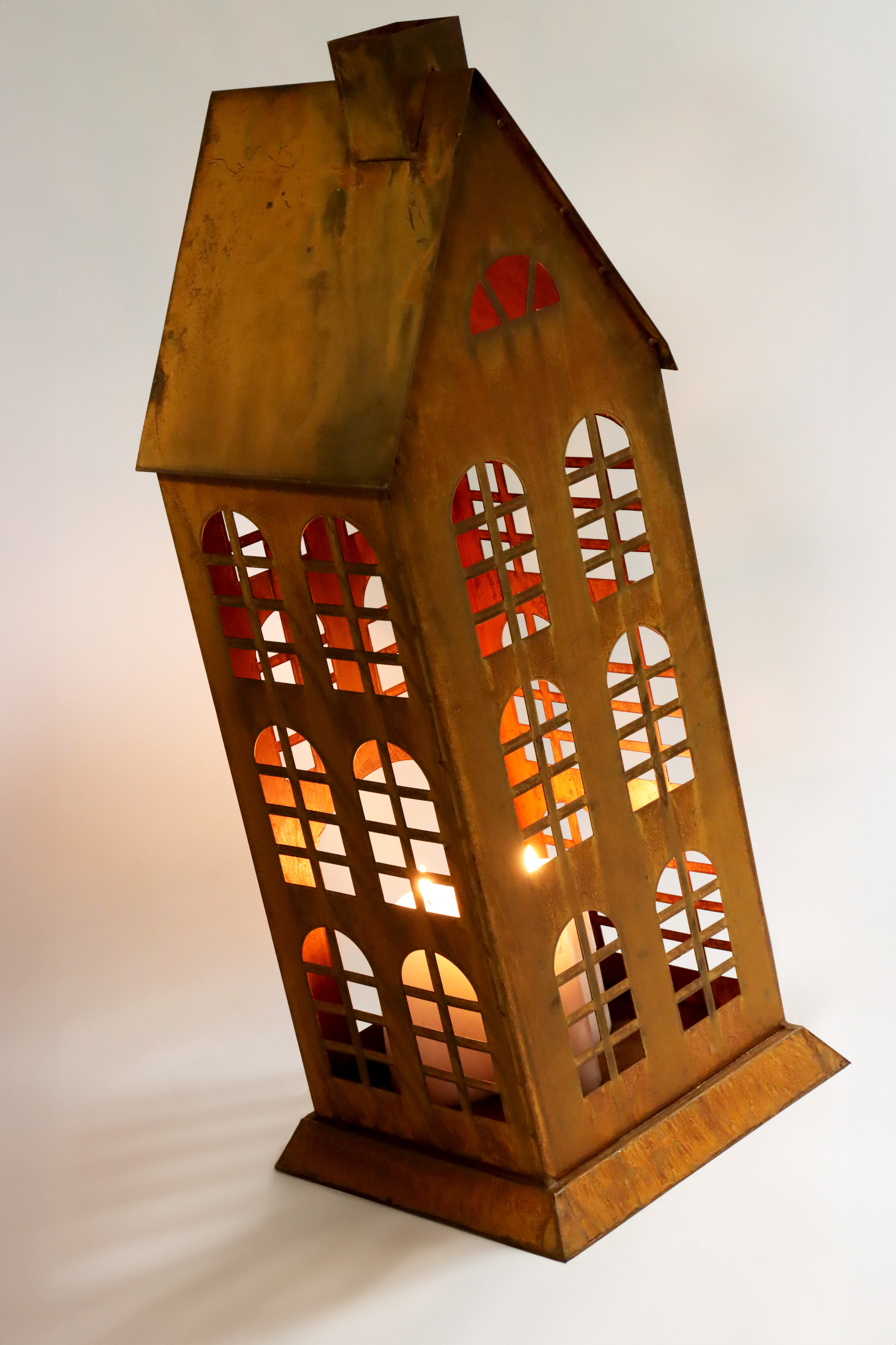 Das Laternenhaus "La Ville", Artikelnummer 7286, ist aus robustem Eisen gefertigt und in einem rostigen Farbton gehalten, der das Design des Artikels insgesamt vintage und einzigartig macht. Es weist eine beachtliche Höhe von etwa 65 cm auf und ist daher ein echter Eyecatcher in jedem Raum.