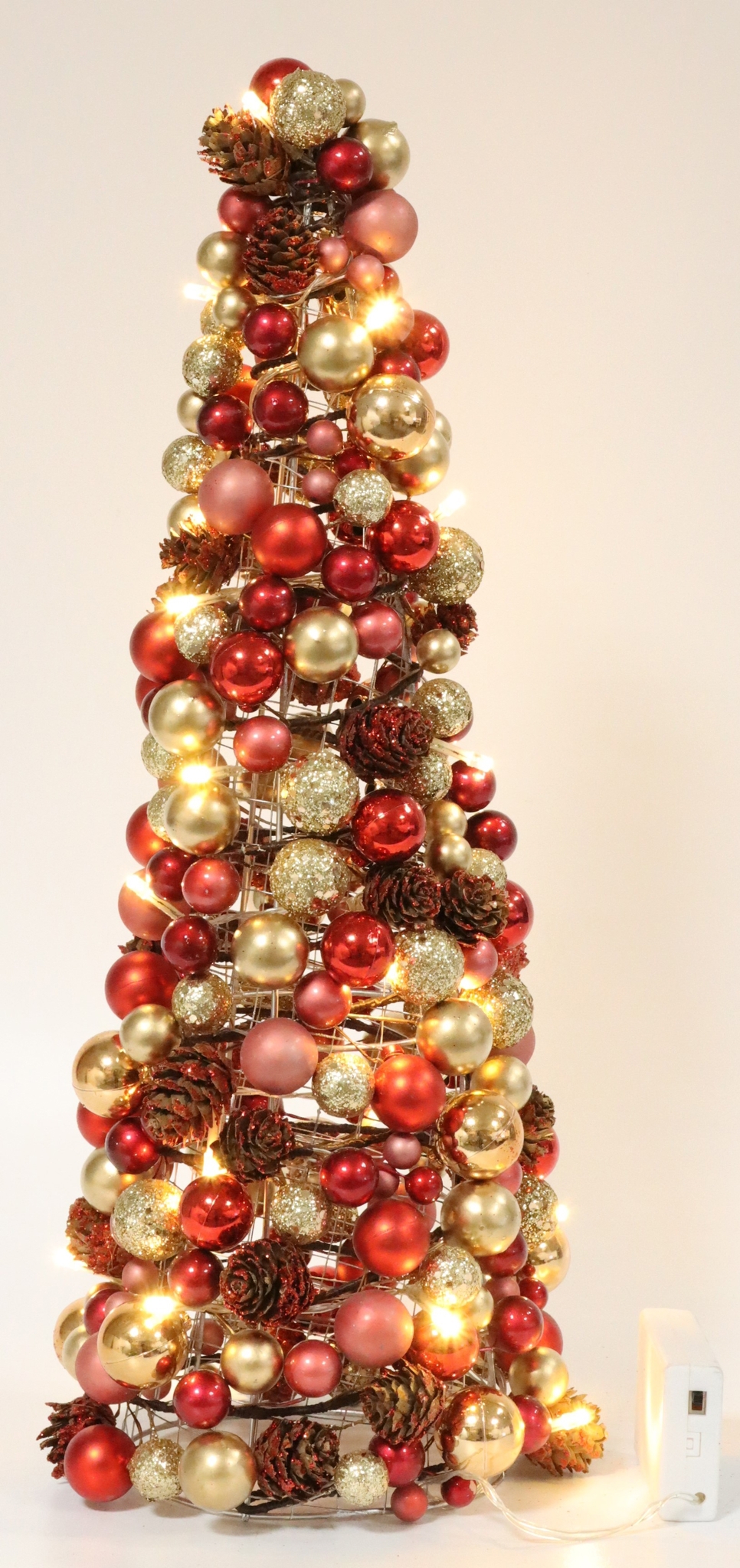 Unser großer LED-Leuchtbaum ist ca. 48 cm hoch und zeigt sich elegant in den klassischen Weihnachtsfarben Rot und Gold. Hergestellt aus hochwertigem Kunststoff und Metall, strahlt das Produkt Robustheit und Langlebigkeit aus. Die bauchige Form und das glänzende Farbspiel verleihen ihm eine echte Festtagspräsenz und er steht in voller Pracht dank einer Batteriebetriebenen LED-Beleuchtung– perfekt für ein leuchtendes Weihnachtsfest.