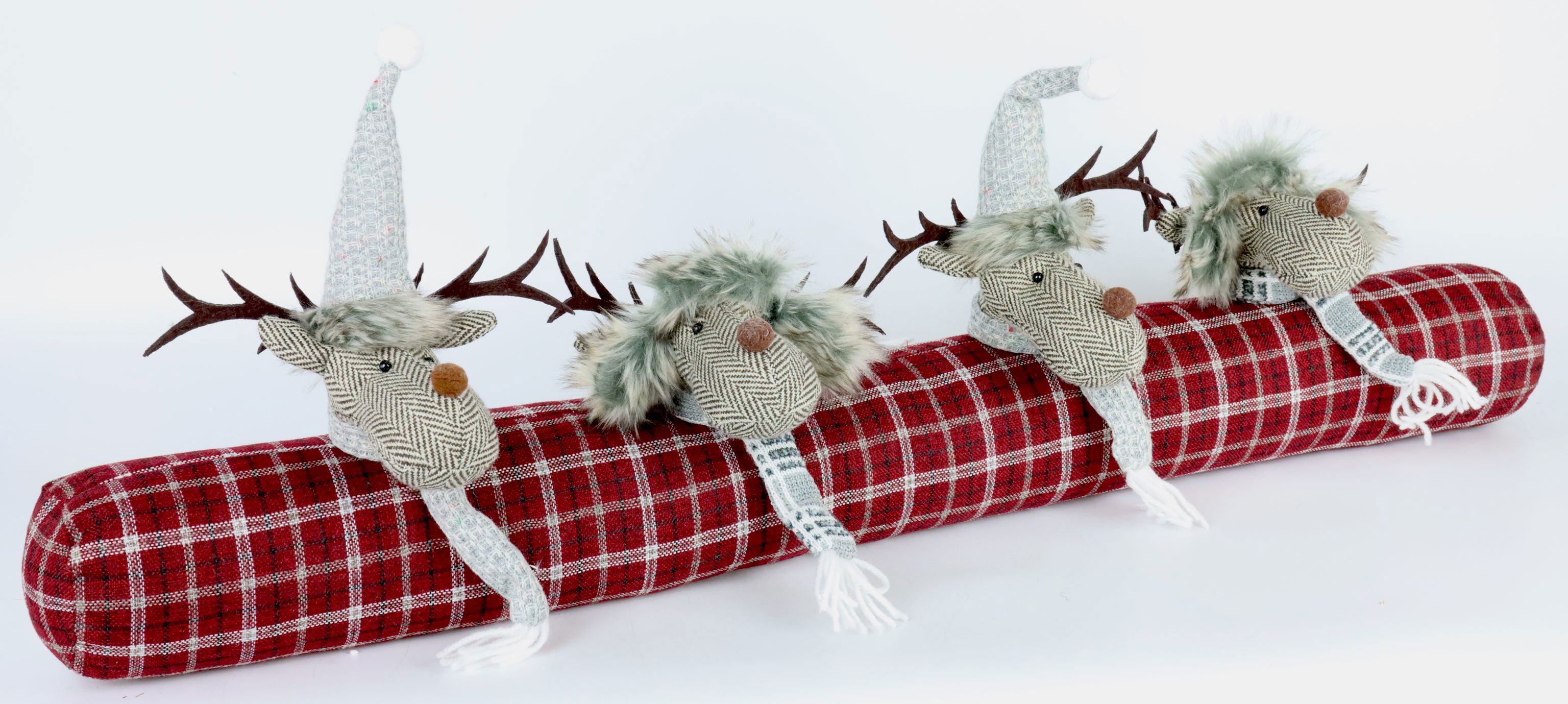 Schlüsselwörter: Zugluftrolle, Funny Moose, Weihnachtsdekoration, rotes Karomuster, Elchmotiv, Polyester-Produkt, saisonales Produkt, Wohn- und Lifestyle-Einzelhandel.