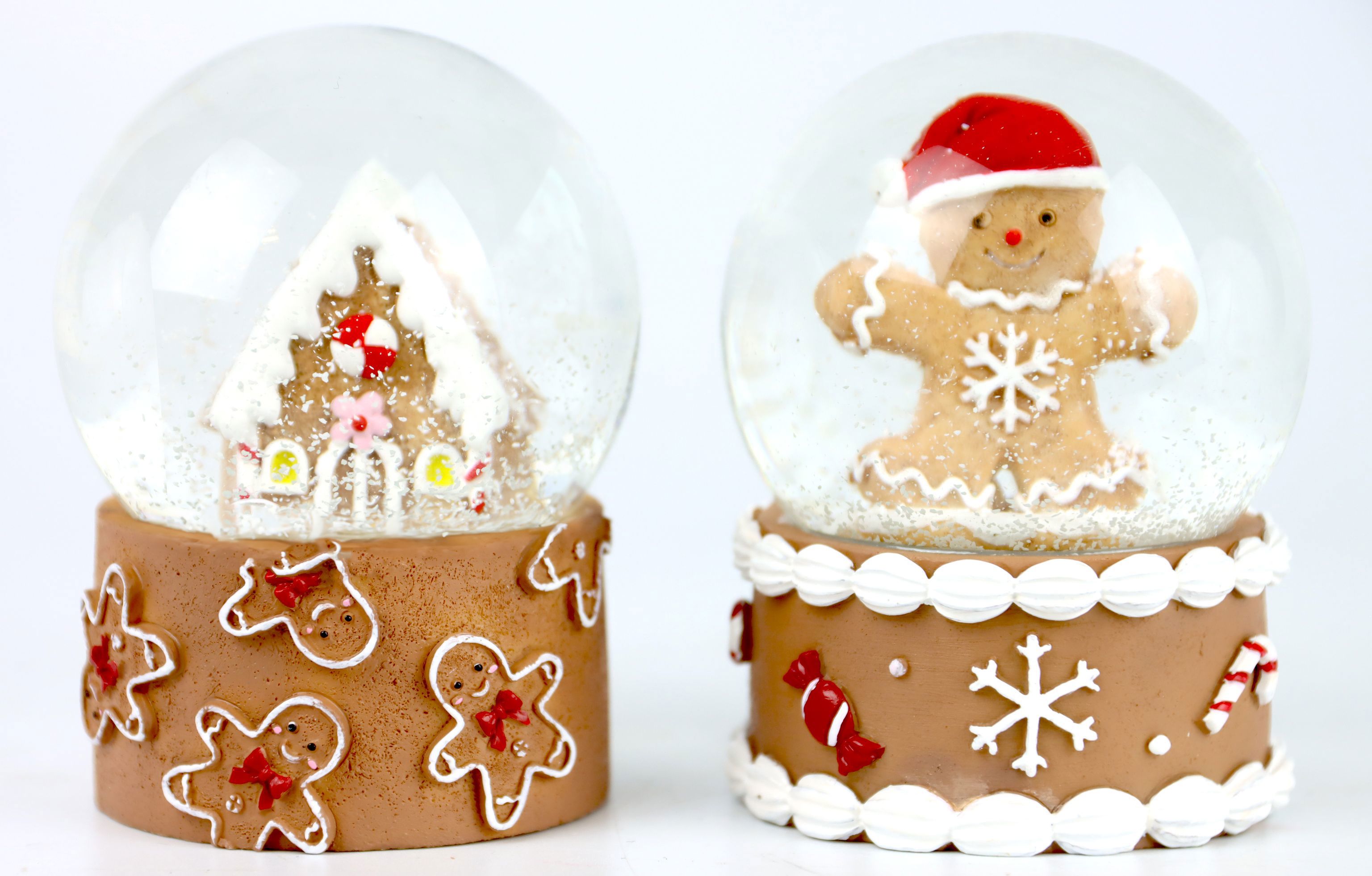 Das Set besteht aus zwei handgefertigten Schneekugeln, die jeweils ein detailverliebtes Lebkuchenhaus aus hochwertigem Polyresin unter einer klaren Glaskuppel präsentieren. Mit einer Größe von ca. 8,5 cm sind sie ideal für Regale, Vitrinen oder als Highlight in Ihrem Weihnachtsdisplay. Die liebevoll gestalteten Details der Lebkuchenhäuser und die sanft fallenden Schneeflocken schaffen eine festliche Atmosphäre, die Ihre Kunden in Weihnachtsstimmung versetzt und die Verweildauer in Ihrem Geschäft verlängern kann.
