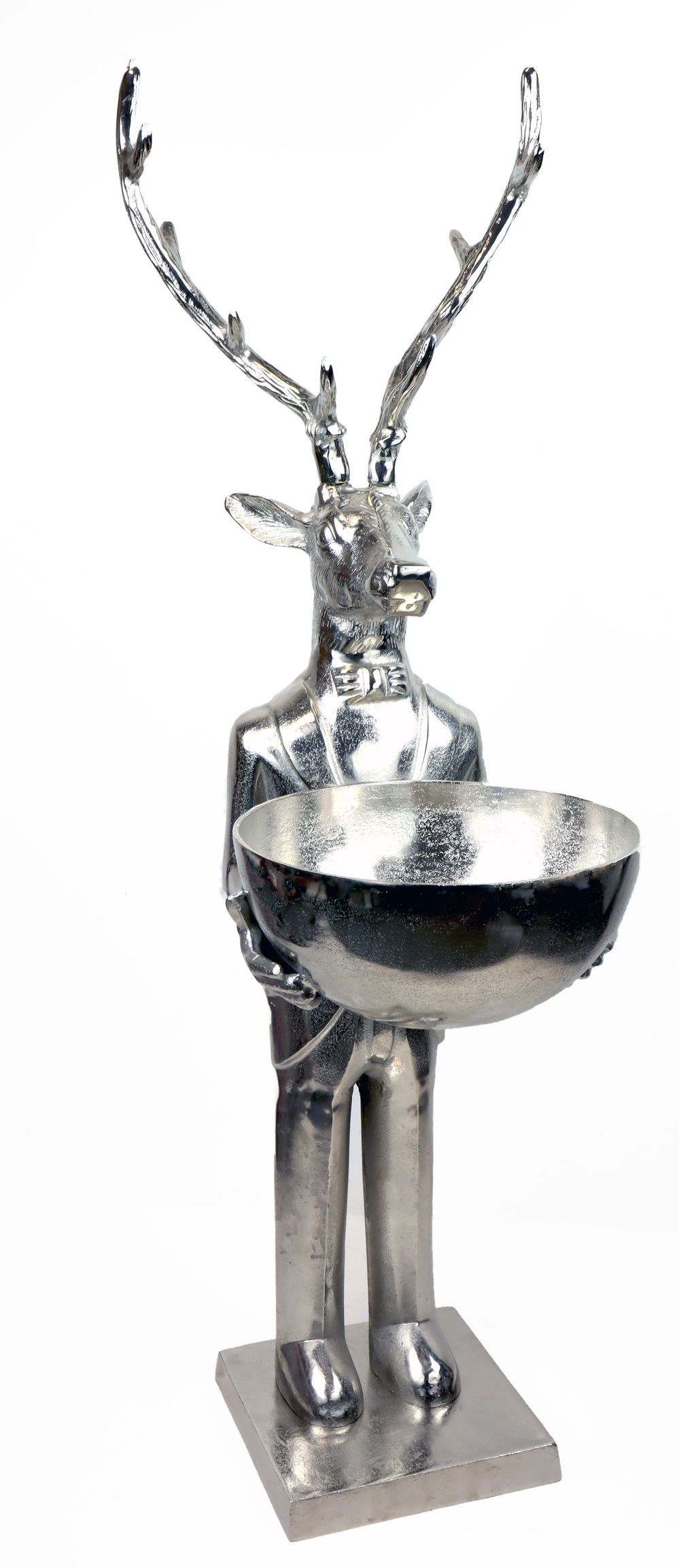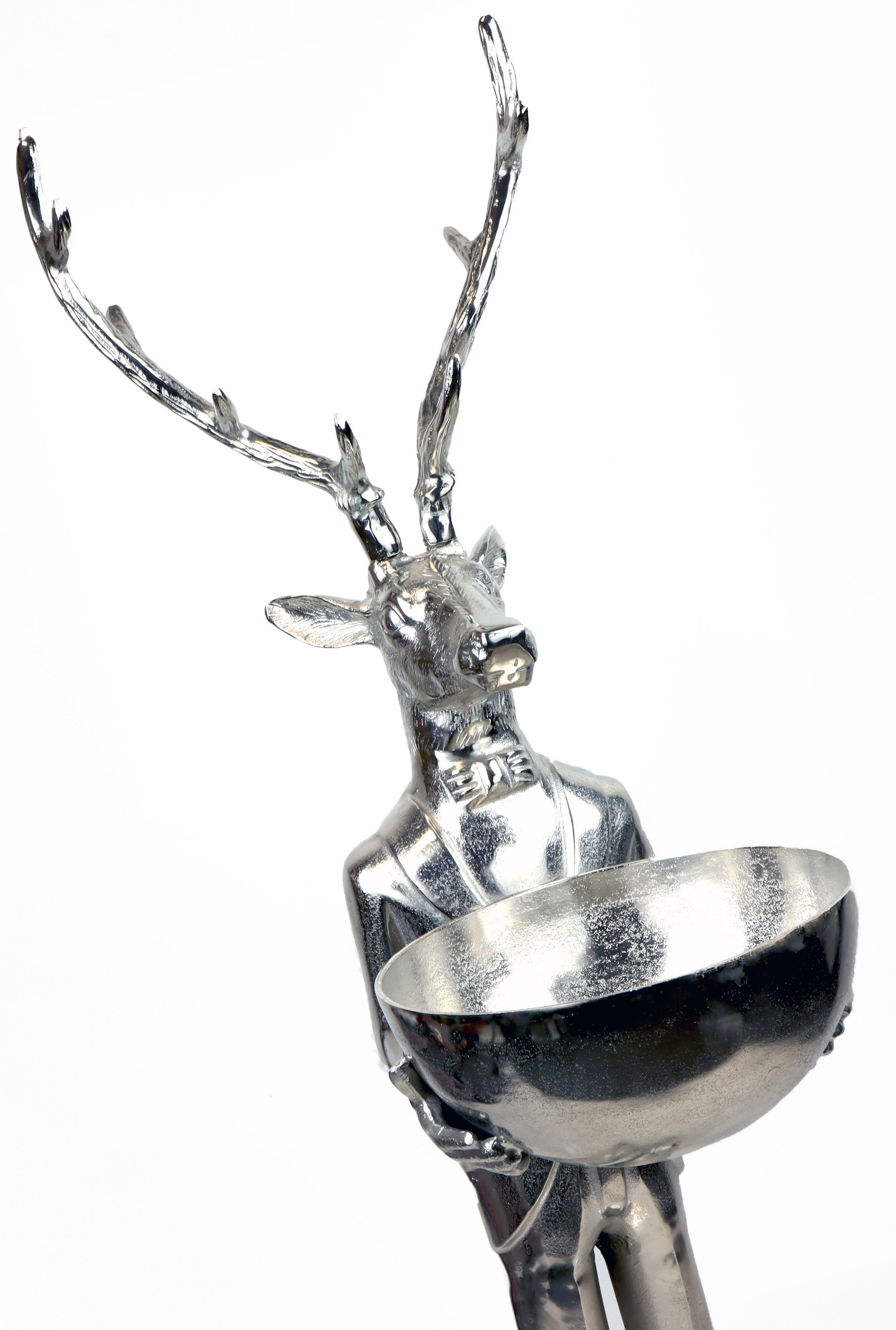Mit einer Größe von etwa 116 cm ist dieser Butler Hirsch ein wahrer Blickfang und eignet sich ideal für die Saison Herbst/Winter. Die dezent glänzende silberne Oberfläche verleiht dem Butler Hirsch ein edles Aussehen, das perfekt in moderne sowie klassische Einrichtungsstile integriert werden kann. Dieser Herbst-Winter-Dekoartikel ist mehr als nur ein einfaches Dekorationsstück: Seine in Silber gehaltene Schüssel bietet Platz für allerlei Kleinigkeiten – von Schlüsseln über Schmuck bis hin zu kleinen Snacks oder saisonalen Blumendekorationen.