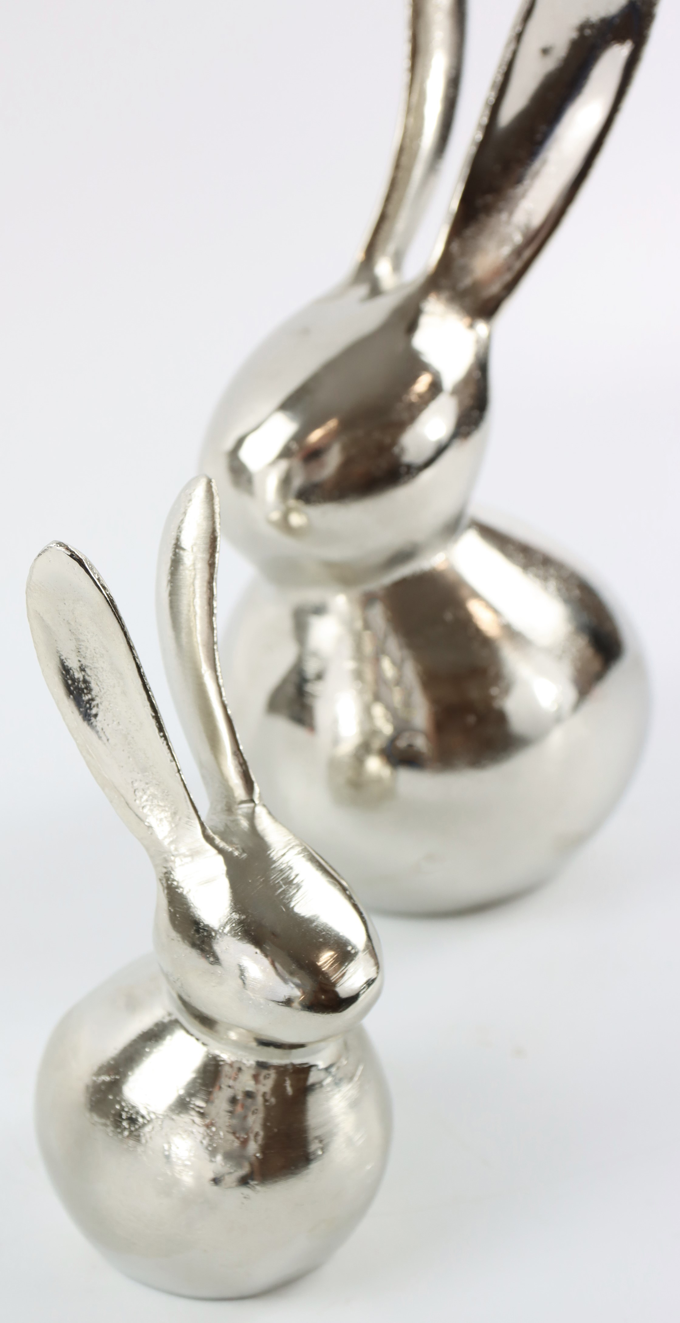 Die Größen der Hasen sind auf unterschiedliche Höhen ausgelegt – ein Hase misst circa 15 cm und der andere stattliche 24 cm. Dies ermöglicht eine dynamische Präsentation, die verschiedene Ebenen schafft und so das Interesse Ihrer Kunden weckt. Durch das Zusammenspiel von Höhendifferenz und dem glänzenden Silber, das Licht reflektiert, werden diese dekorativen Hasen zu einem stilvollen Blickfang in jeder Umgebung.