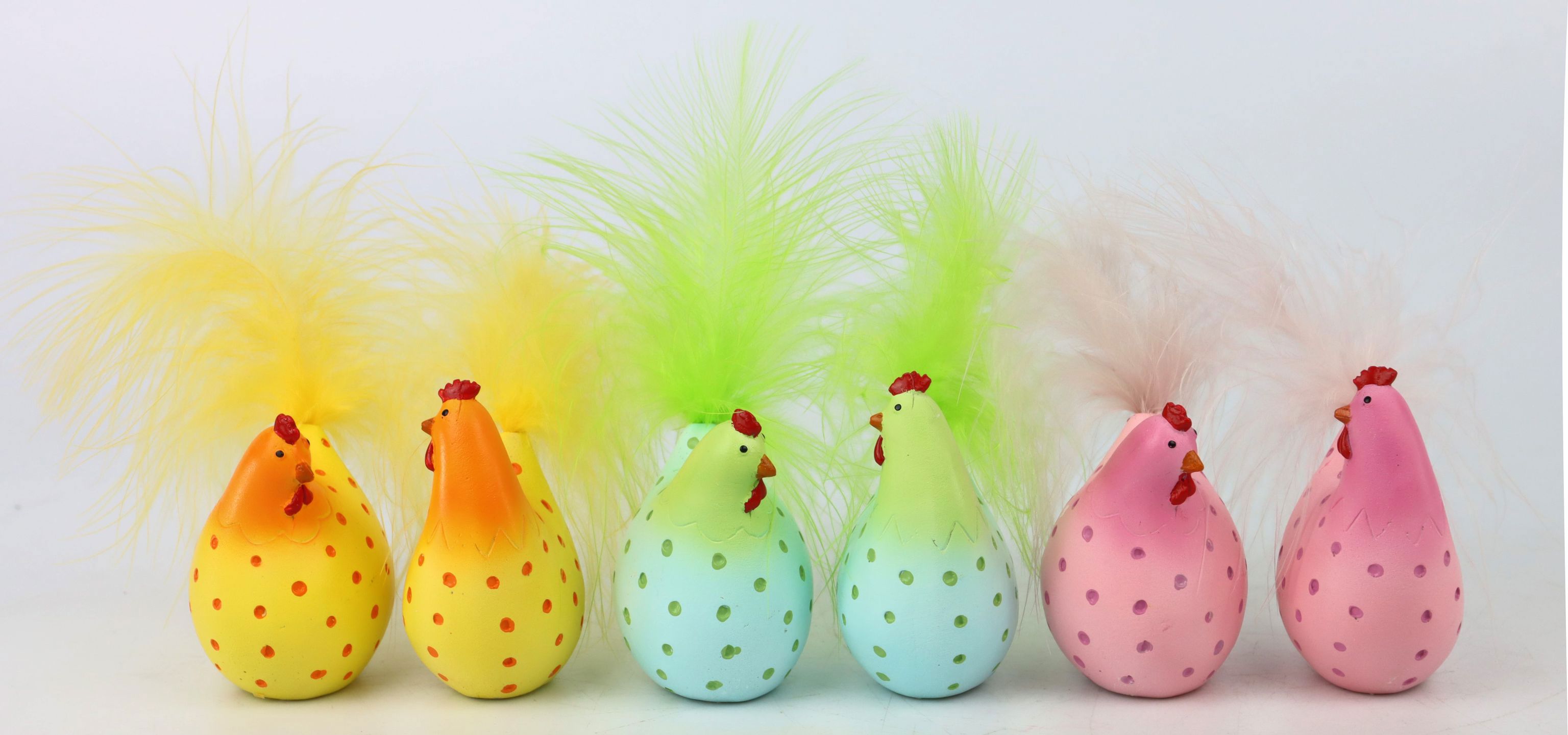 Diese entzückenden Hühner sind speziell für die Osterzeit gestaltet, strahlen jedoch eine zeitlose Niedlichkeit aus, die sich auch über die Feiertage hinaus bemerkbar macht. Jedes Huhn ist liebevoll mit verspielten Punkten verziert, was dem Gesamtbild eine einzigartige Textur und ein charmantes Erscheinungsbild verleiht. Diese Hühner im fröhlichen Design verleihen jeder Umgebung eine gewisse Frische und heben die Laune Ihrer Kunden.
