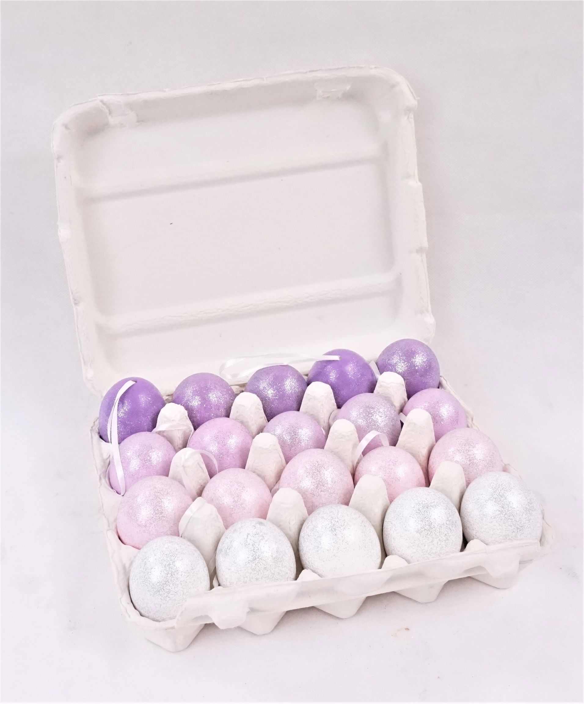 Unser EIERDISPLAY "LILA" S/20 ist durch die leuchtenden lila Töne und den fein eingearbeiteten Glitzer ein wahrer Hingucker. Diese Ostereier eignen sich ideal zur Dekoration von Regalen, Tischen oder Schaufensterdisplays und sprechen Kunden an, die Wert auf trendige und zugleich hochwertige Dekoration legen. Geben Sie Ihrem Laden eine frische, saisonale Note, die zum Verweilen und Einkaufen einlädt. Dank des hochwertigen und stabilen Eierkartons ist das Set leicht zu handhaben und transportieren.