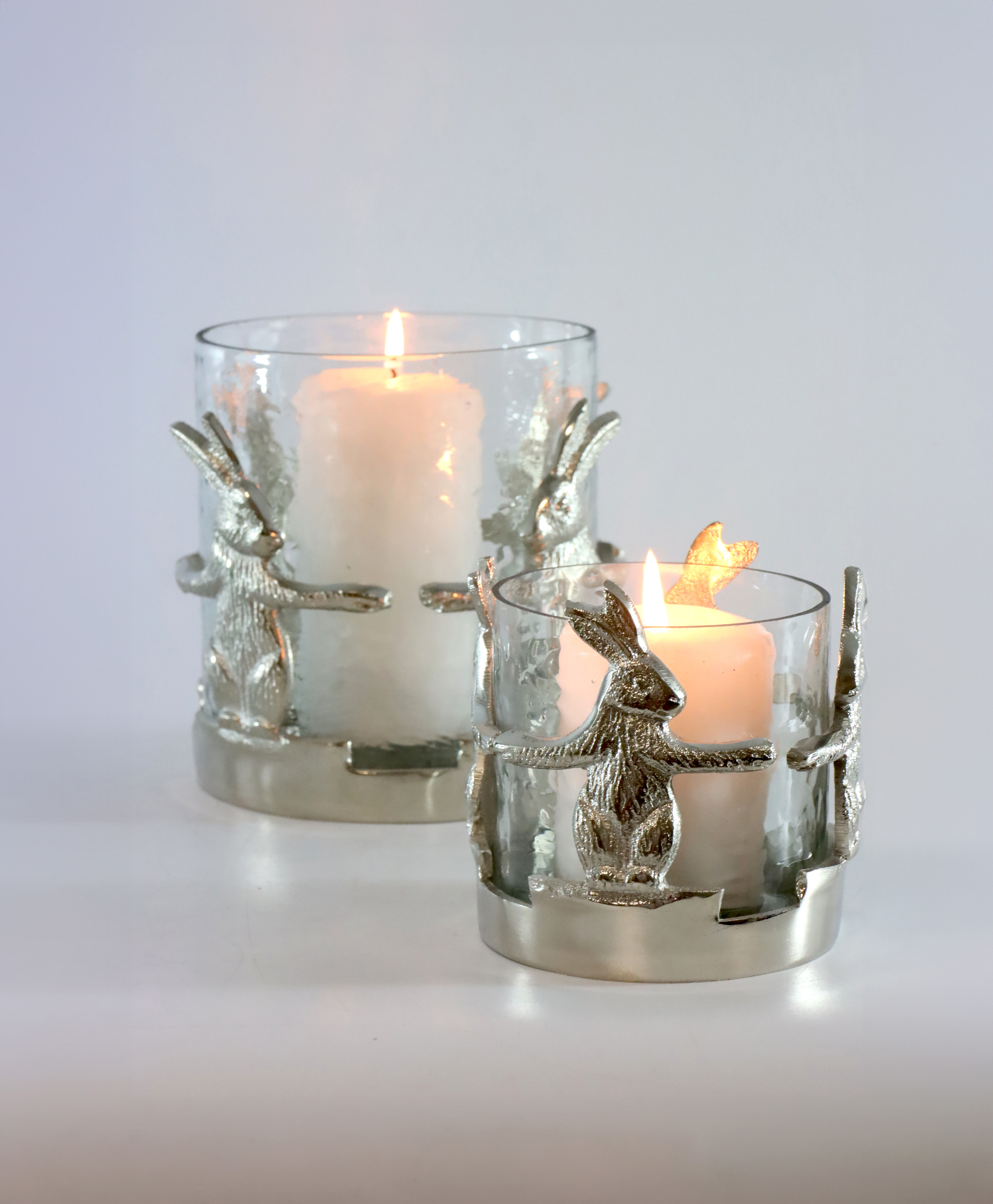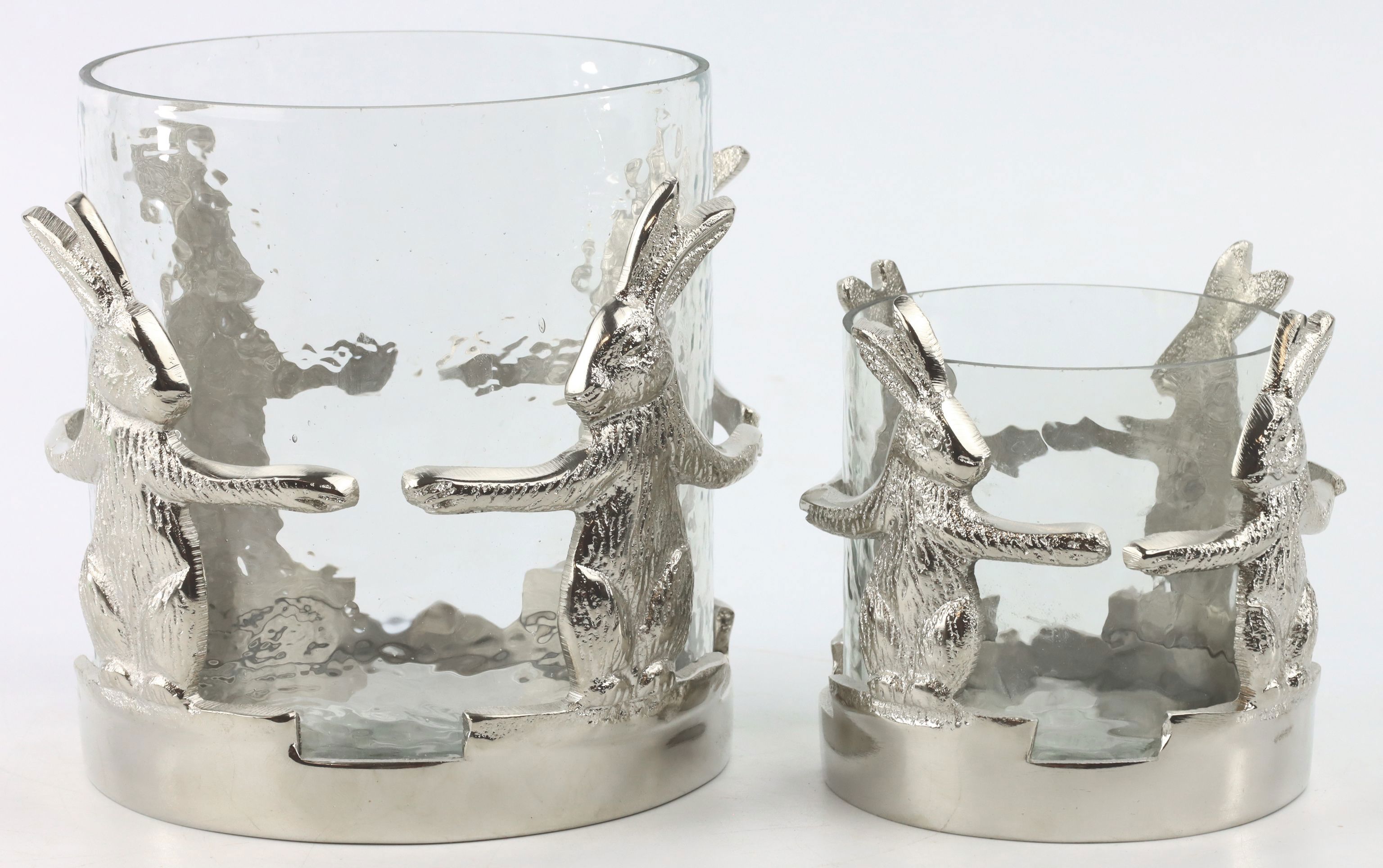 **Produktbeschreibung für das 2-teilige Windlichterset "Hasen" aus Alu vernickelt**