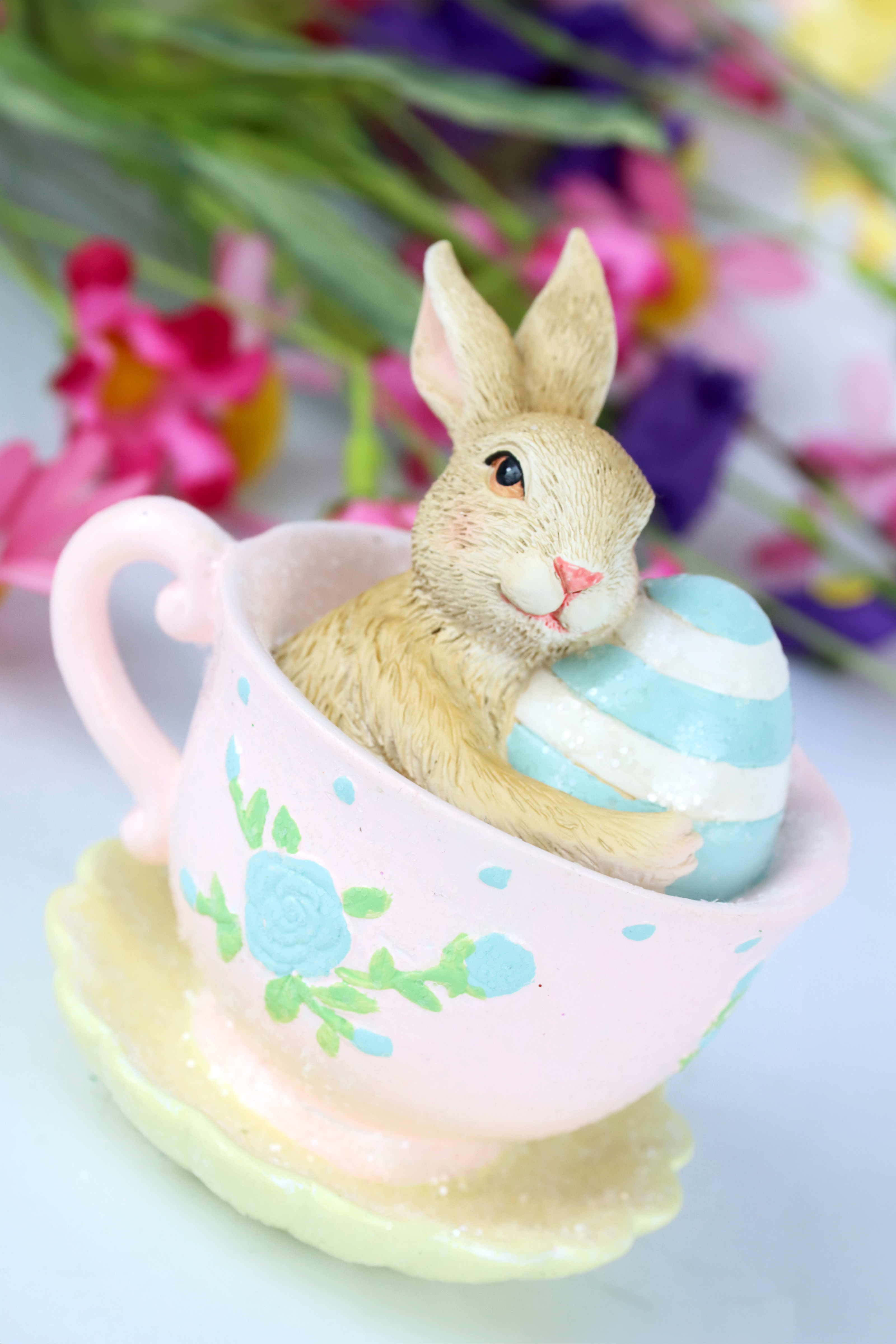 - **3-teiliges Hasentrio**: Niedliche Hasenfiguren, die in Tassen sitzen, bringen eine verspielte Note in Ihre Osterkollektion.