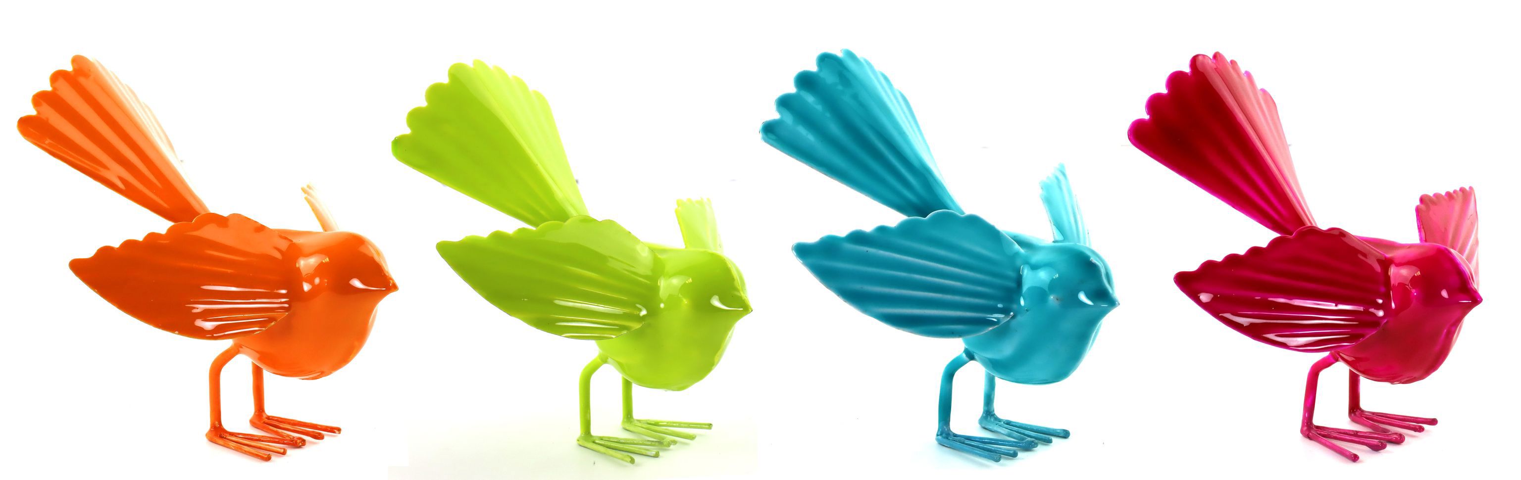 Das Set besteht aus vier stehenden Figuren, die in strahlenden Farben wie Orange, Grün, Türkis und Rot gehalten sind. Jedes Vogelfigürchen ist aus hochwertigem, emailliertem Eisen gefertigt und misst etwa 14 cm in der Höhe. Diese robusten und zugleich eleganten Deko-Elemente sind ideal, um in Auslagen für frische Akzente zu sorgen, sei es im Schaufenster oder als Tischdekoration in Ihrem Laden.
