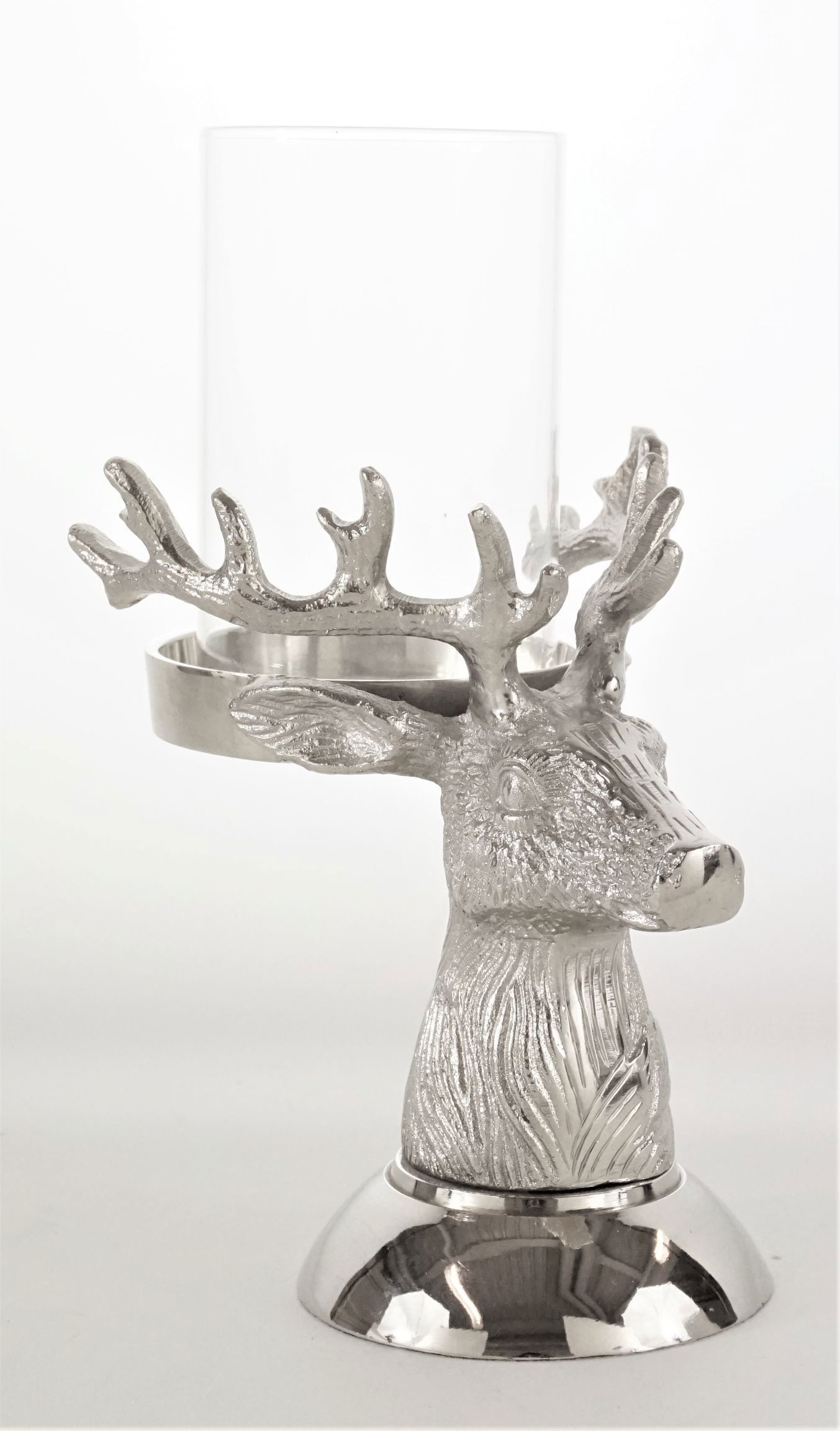 Unser "HIRSCH" Leuchter ist aus hochwertigem Aluminium im schicken Silber-Finish gefertigt und garantiert eine hohe Langlebigkeit. Dieses Accessoire spiegelt die Symbiose von modernem Design und Natürlichkeit wider. Das dekorative Hirsch-Motiv bringt einen Hauch von rustikaler Wildnis in Ihr Zuhause und schafft gleichzeitig eine gemütliche Atmosphäre. Mit seiner Höhe von etwa 24 cm ist dieser Leuchter eine bemerkenswerte Bereicherung für jede Tisch- und Raumdekoration.