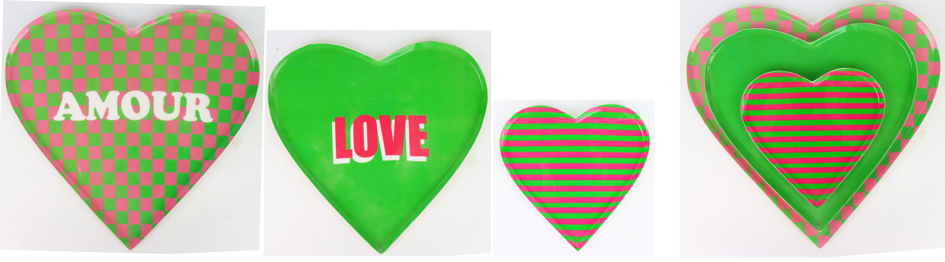 Entdecken Sie unser zauberhaftes Herztablett-Set "Message" im praktischen 3er Pack, das pünktlich zur Frühjahr/Sommer Saison Ihre Räume mit einer Extraportion Charme erfüllt. Diese dekorativen Herztabletts sind die ideale Ergänzung für den stationären Einzelhandel im Bereich Wohnen und Lifestyle. Jedes Metalltablett ist nicht nur ein nützliches Accessoire, sondern auch ein stilvolles Dekorationselement.